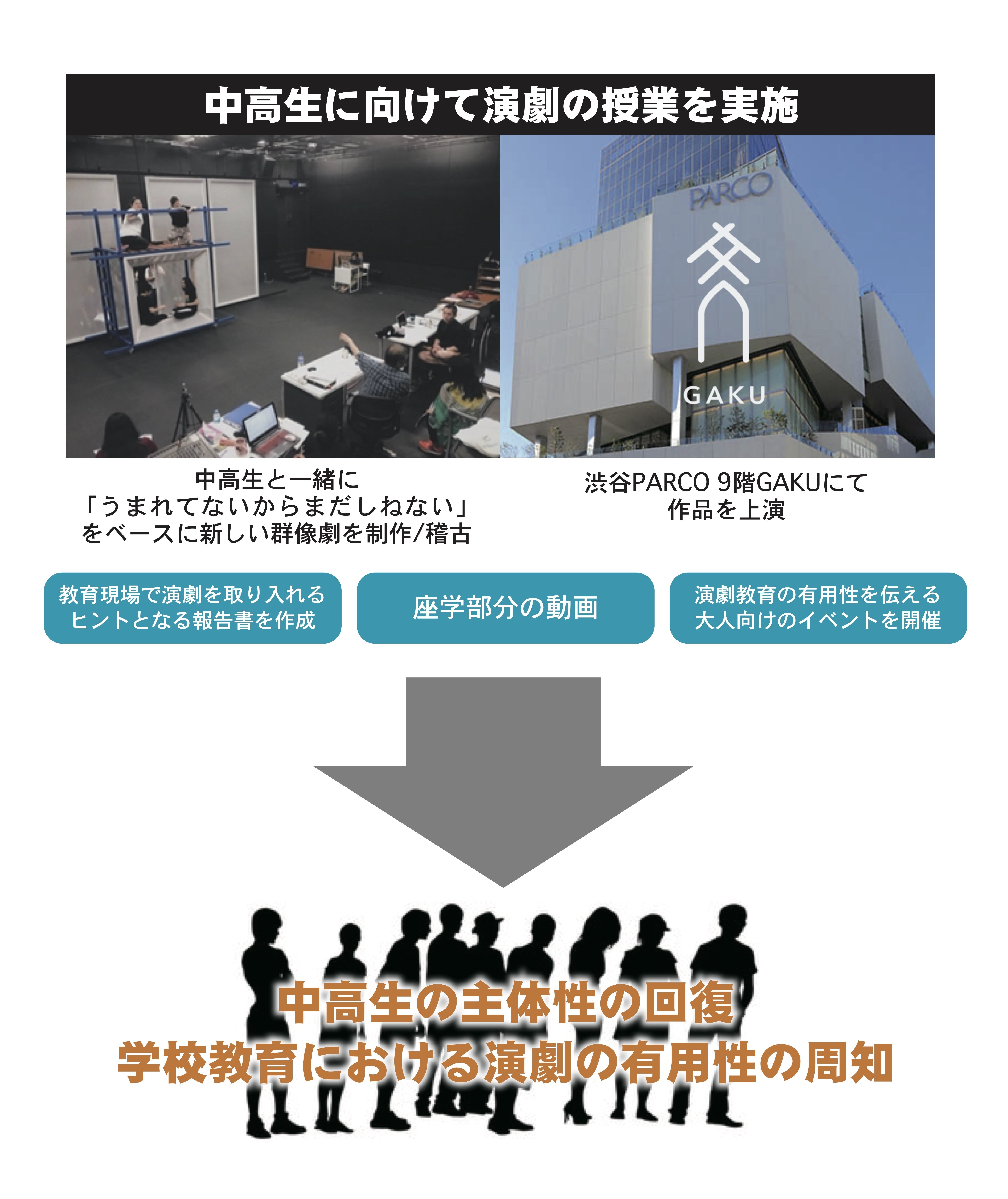 今回のプロジェクトでは、演劇集団「範宙遊泳」代表で劇作家の山本卓卓さんを講師に招き、中高生と一緒に「範宙遊泳」の代表作である『うまれてないからまだしねない』をベースに新しい群像劇をつくります。完成した作品を渋谷PARCO9階のGAKUにて上演するだけでなく、演劇の制作過程で行われる山本さんの講義の様子も撮影・アーカイブし、中学・高校での演劇教育のヒントとなるような機会をつくります。コロナにより演劇と触れる機会を失ってしまった10代。演劇に興味のある中高生が集える「居場所」を作っていきたいと考えています。