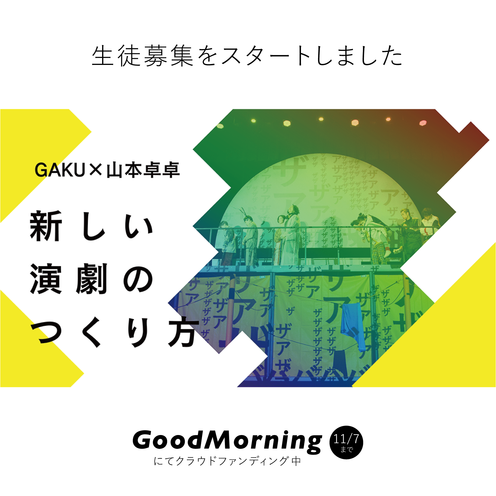 今回は、GAKUとしてはじめてのクラウドファンディングへの挑戦。演劇集団「範宙遊泳」代表で劇作家の山本卓卓と中高生が、一緒に新しい演劇を完成させ、同作品の上演を目指すプロジェクト。とても長いページで恐縮ですが、是非最後までお読みくださいますと幸いです。