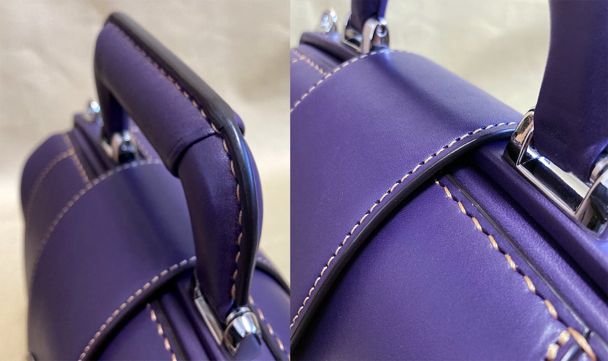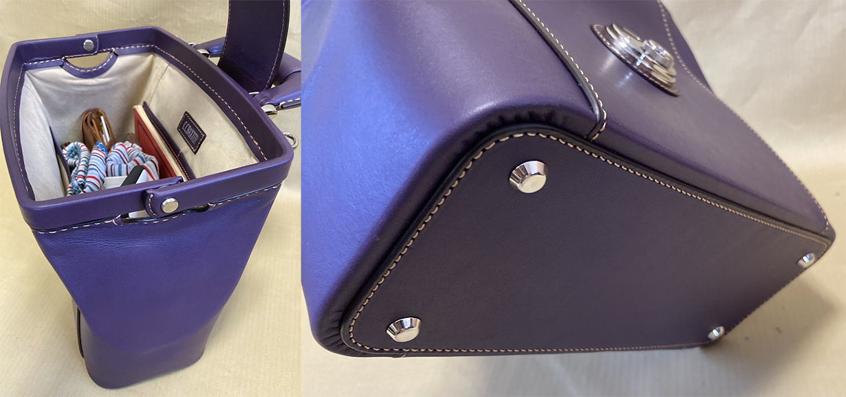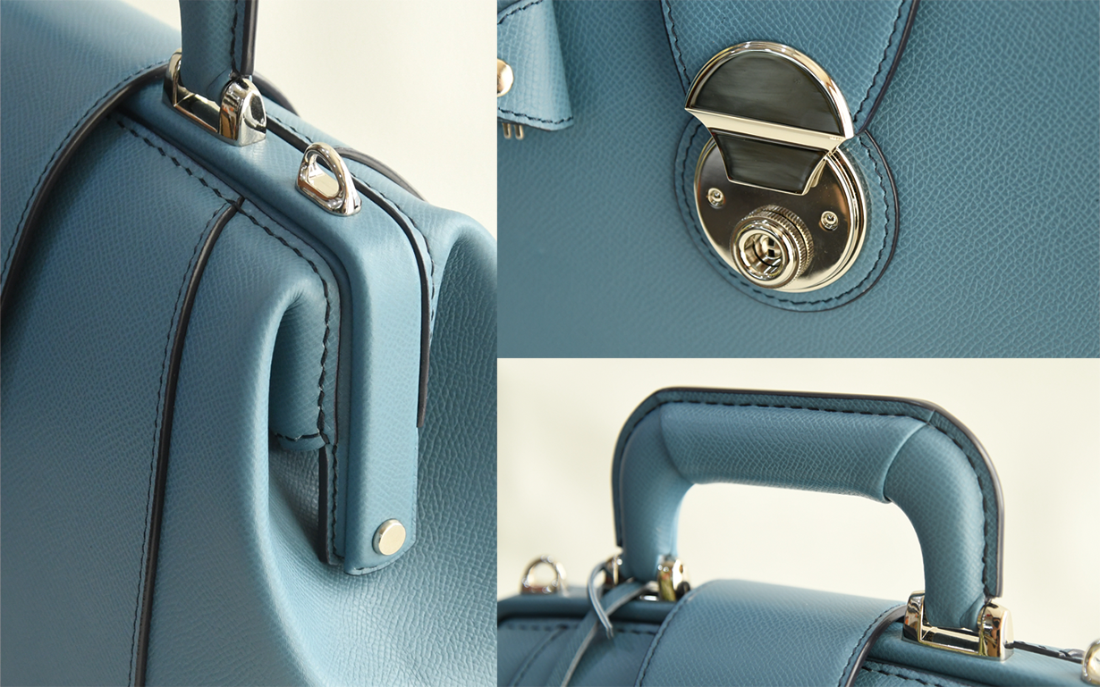 広いマチと金属の口金により大きく箱型に開く開口部や、ファスナーではなくクラシックな錠前金具を使用していることなどが主な特徴です。また、立体的な構造と、革という素材の厚みや丈夫さによって、気品ある自然なフォルムを持ち、いわゆる「型崩れ」の心配もほとんどありません。