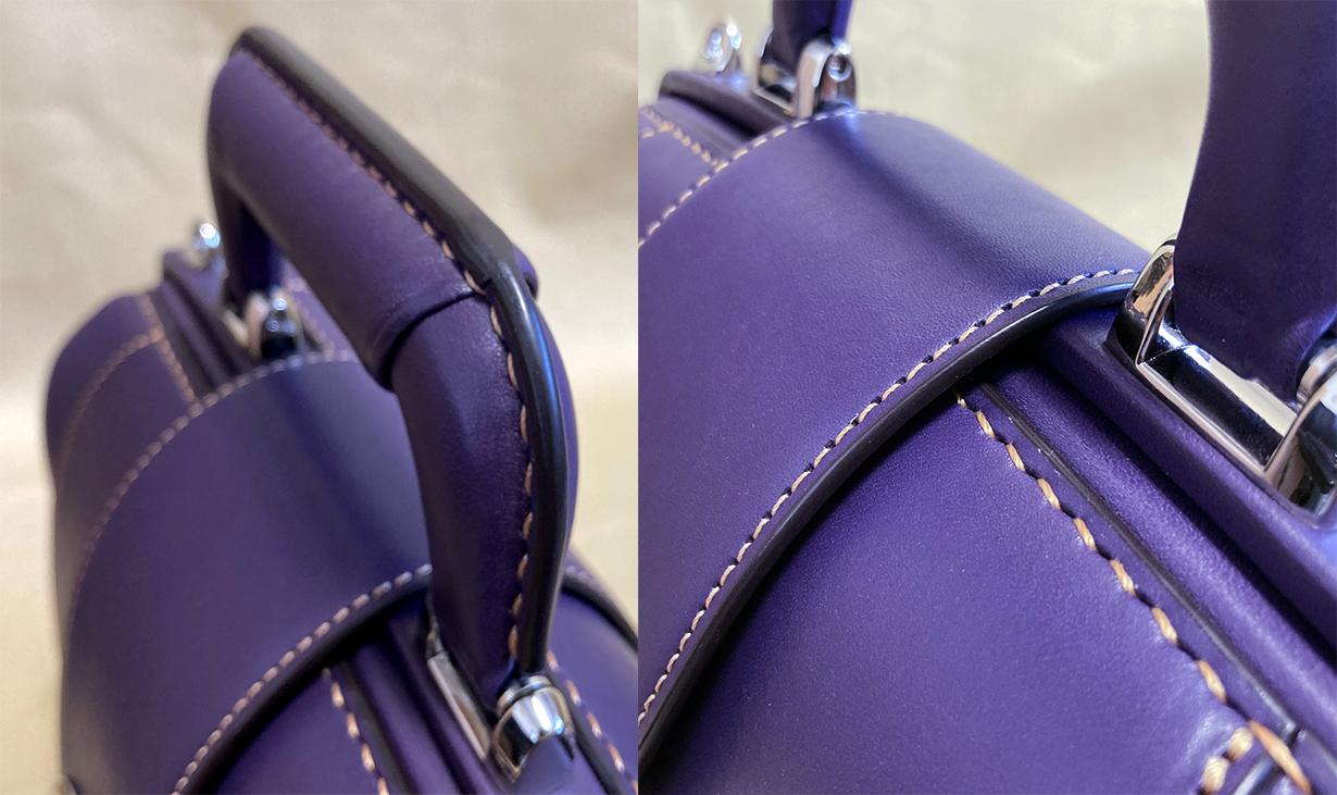 手のひらにしっくりと馴染む革の太いハンドルは、細いハンドルのように手に食い込むことなく、手のひら全体で重量を支えることができます。