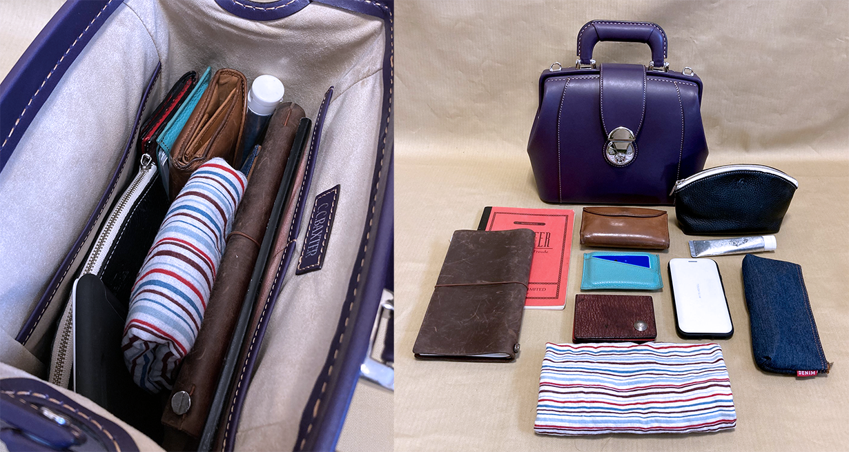これだけのものを入れても鞄のフォルムは崩れず、口枠がしっかり開口部をホールドします。