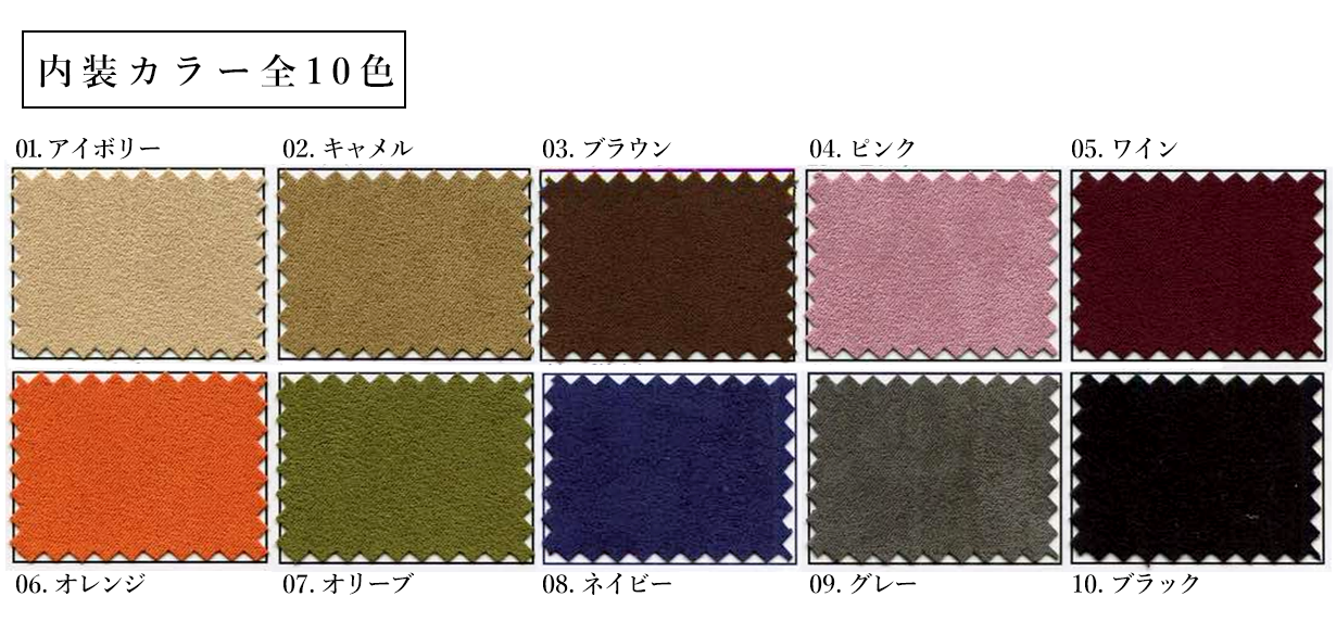 内装はディアスエードという起毛生地を使用しています。名前の通り、スエードのようなスベスベとした滑らかなやわらかい手触りを持つ人工生地です。10色ご用意がありますのでお選びください。