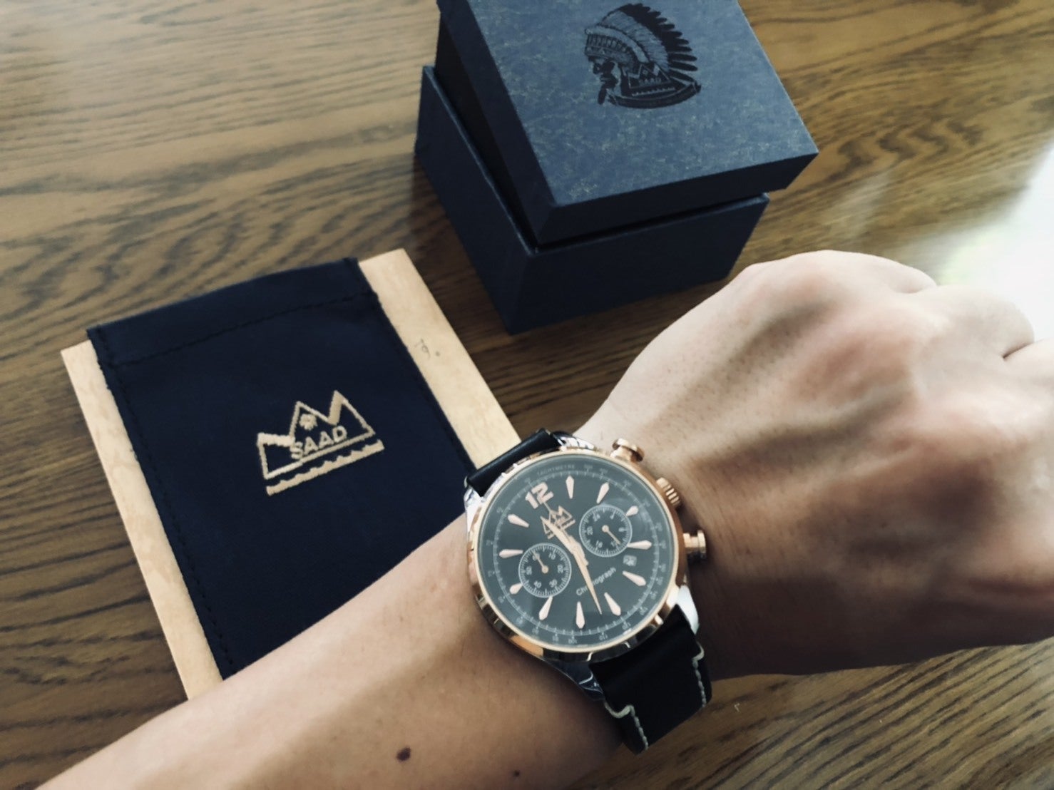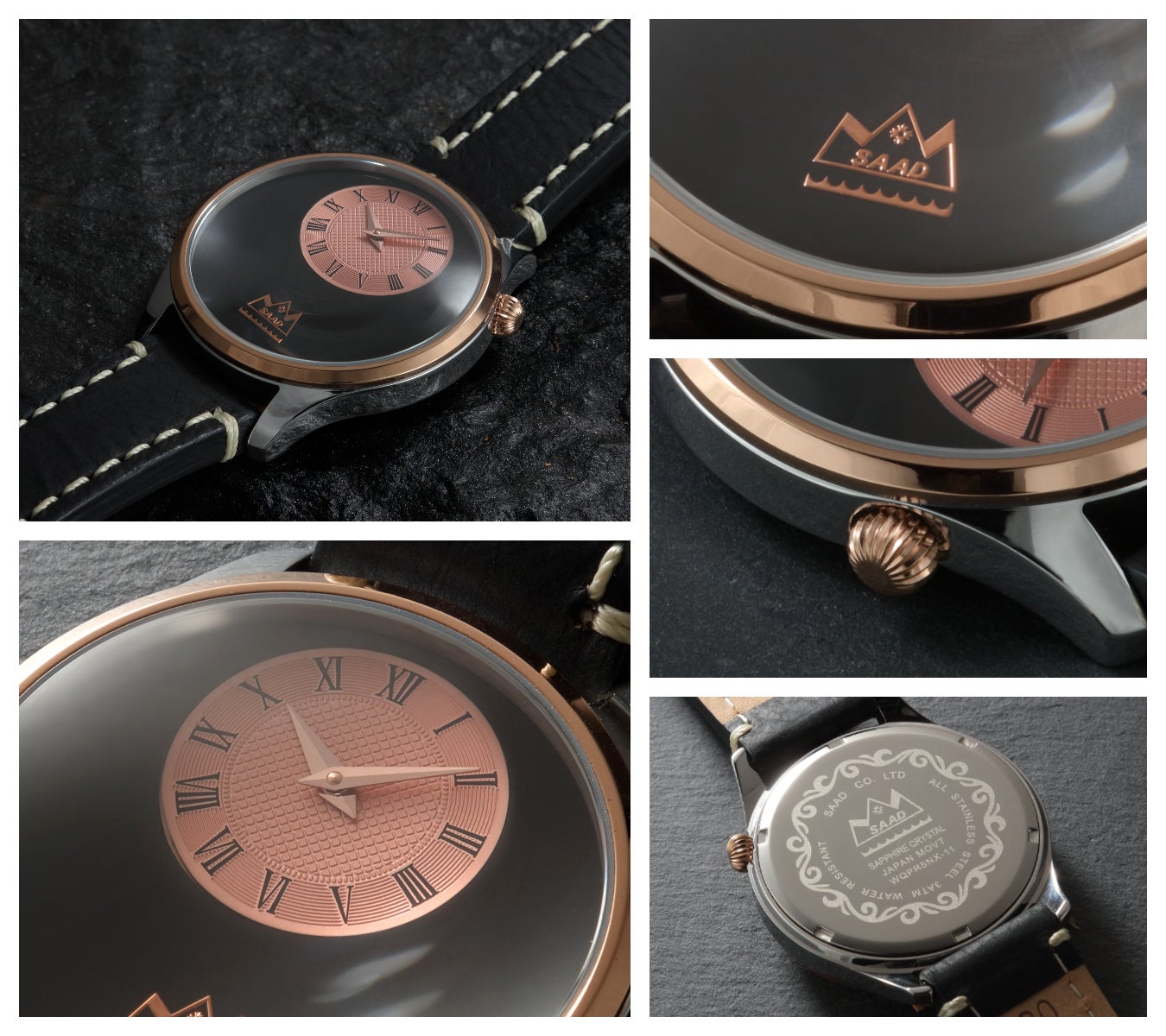 職業柄、ジャケットスタイルが多いので派手すぎず、クールなイメージの腕時計を探していました。このSAADのブラックオニキスの時計は、黒の深みがとても味わい深く、大人の黒コーデにも合うので気に入ってます。ジャケットスタイルではさり気なく、そしてTシャツなどのシンプルな格好の時は1本で存在感があり、流行に左右されないデザインなので、長く愛用したいと思っています。また、作りも精巧で、ベルトも肉厚で重厚、革の経年変化を楽しみたいと思います。