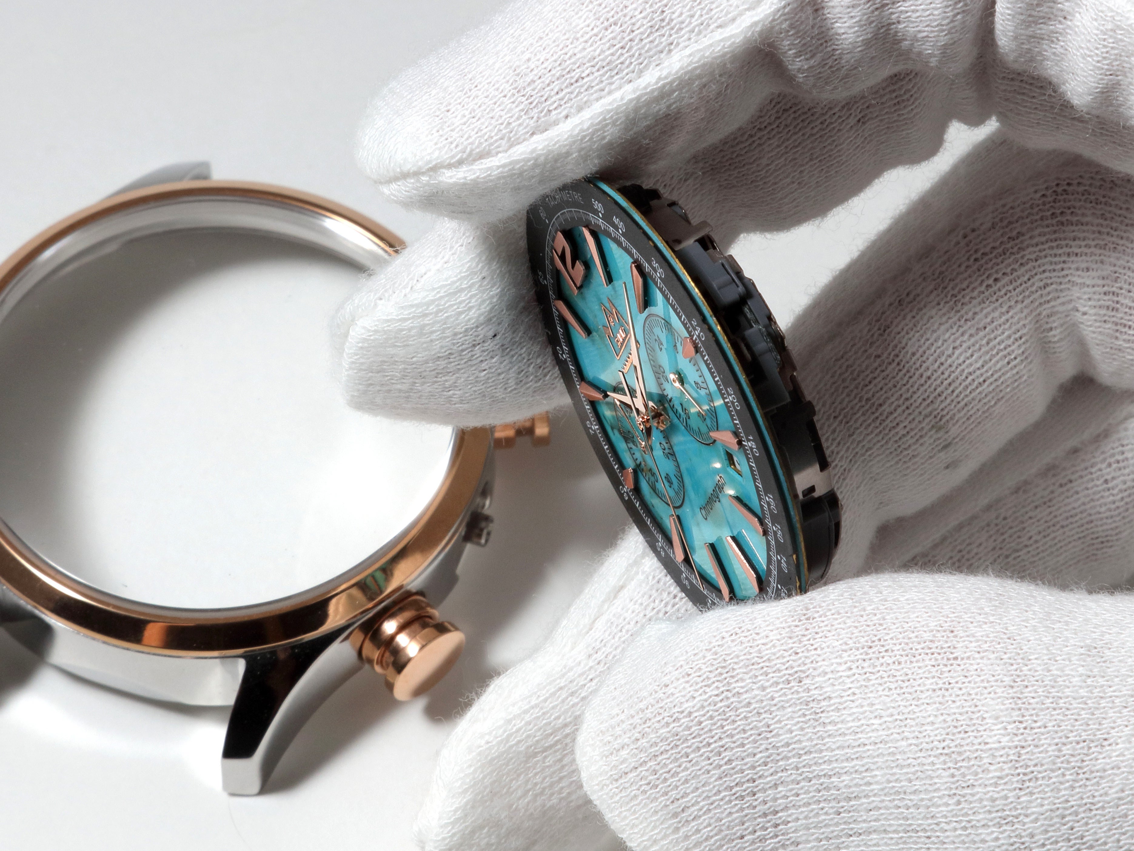 とても繊細かつ複雑な作業のため、精巧な技術を持つ職人でも削りだした石から割れずに製品化できる割合は、たったの13%~15%しかありません。この過程を終え文字盤の組み立てへと移ります。