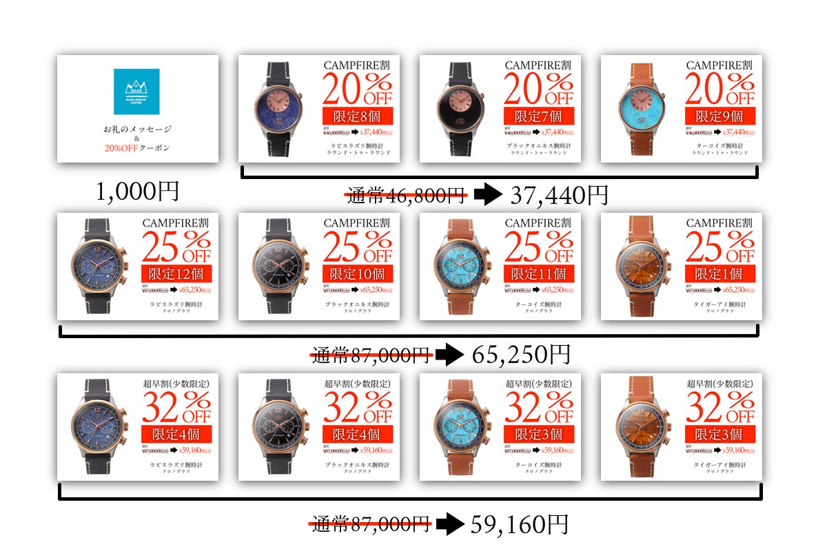 前述の通り、希少で高品質な天然石を厳選して使い、職人の手で一つ一つ大切にお作りしておりますので、大量生産が出来ず、在庫数に限りがございます。今回ご用意出来たリターンも数が少なく申し訳ない気持ちでいっぱいでございますが、腕時計との出会いは一期一会。もし目に止まった時計がございましたら、この機会にご支援頂けますと幸いです。