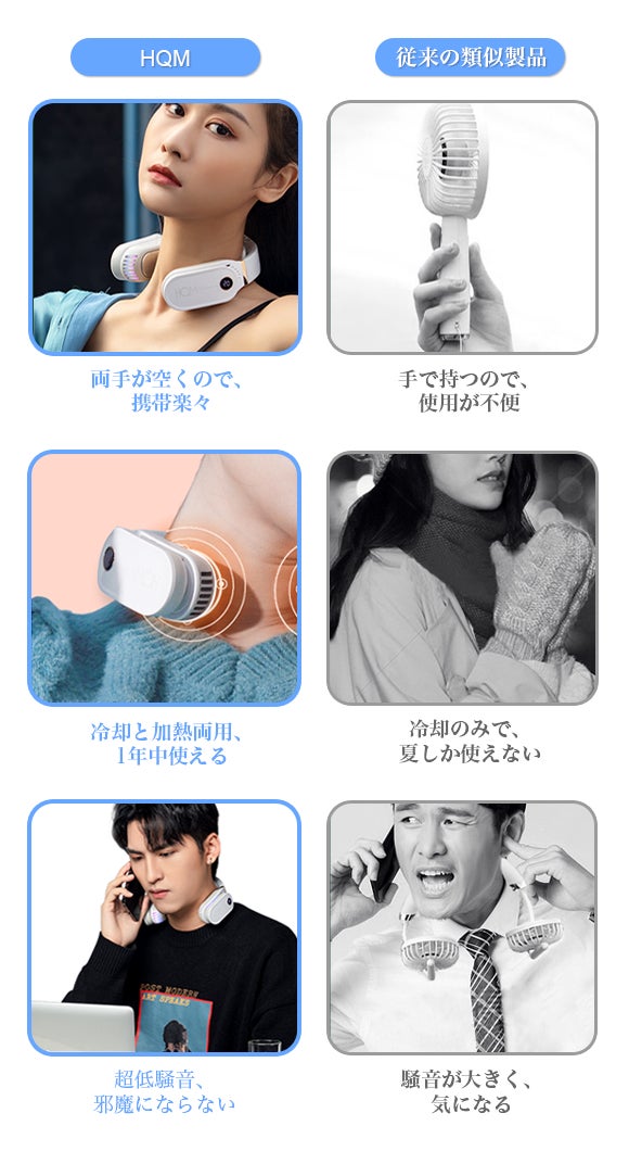 これまでの類似製品と異なり、HQMネッククーラー&ウォーマーは両手が空くので、荷物を持って移動する時やウォーキングなど運動の時に便利です。また冷却と加熱ができますので四季を問わず使用可能。さらに低騒音設計ですので、より快適にお使いいただけます。
