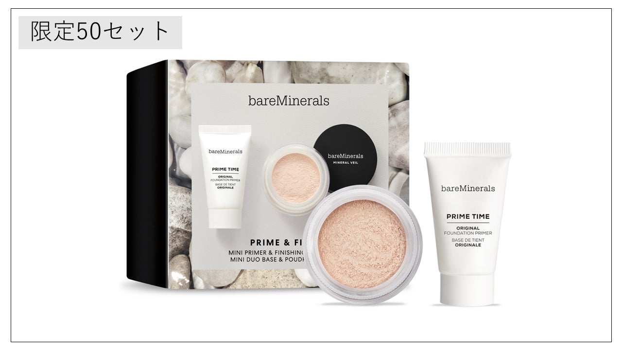 プライム タイム ハーフサイズ(15ml)と、メイクの仕上げやプライム タイムの上に重ねてサラサラな毛穴レス肌になれるミネラル ベール(フィニッシングパウダー)Mサイズのセット。