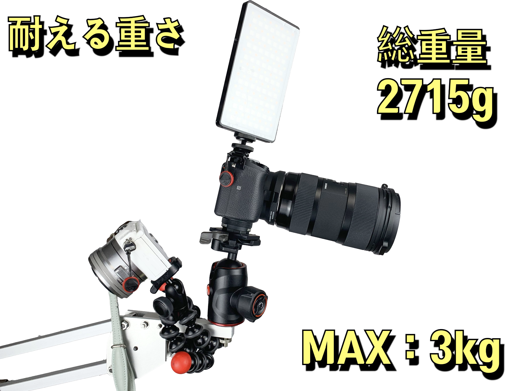 スマホやミニデジカメ程度の大きさに耐えられるスタンドは多いですが、レンズ交換式の一眼レフカメラでも十分に耐えられる性能です。