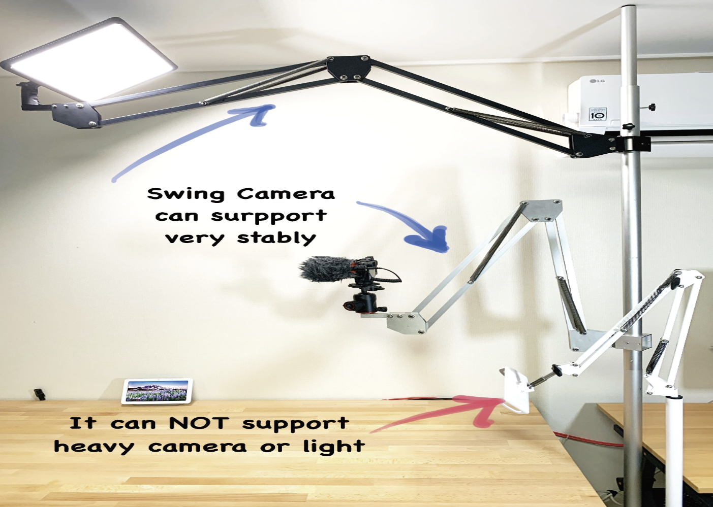 撮影環境によって天井の高さは異なります。スイングマウントは多様な環境にも対応できるよう研究されました。