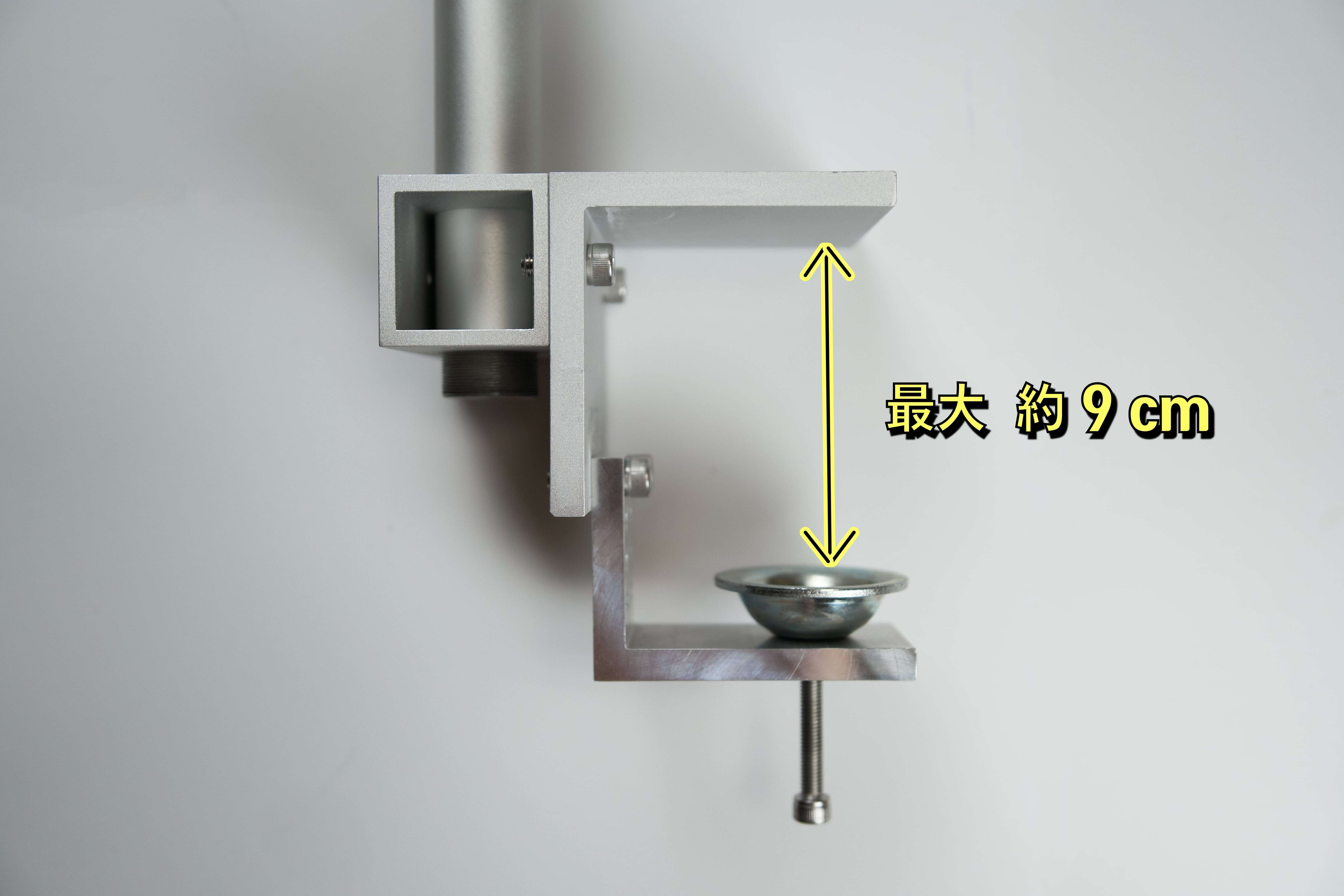 机へのはめ込み部分は8段階に調節でき、最大約9cm幅の机やテーブルに使用できます。