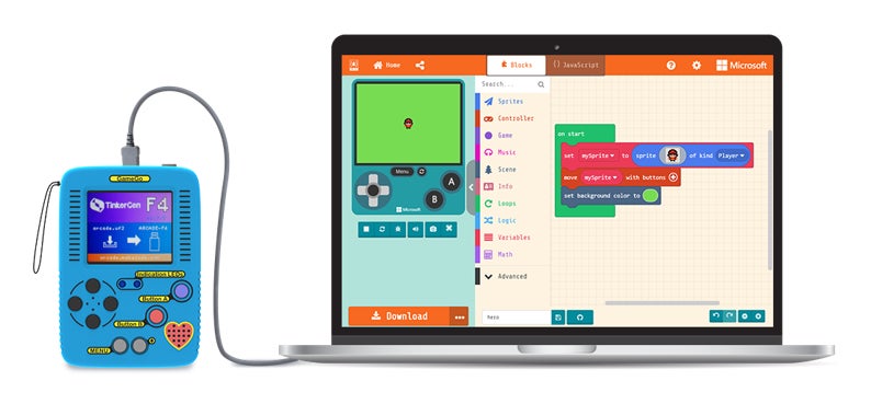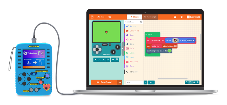 MakeCode Arcadeは、独自のゲームをシミュレートするための人気のあるプラットフォームです。Webブラウザーを介して簡単に使用でき、コードをダウンロードしてGameGoで楽しむことができます。 USBケーブルを使用してGameGoをコンピューターに接続するときは、GameGoの上部にある電源スイッチを押します。画面にはTinkerGen F4アイコンが表示され、その後GameGoにプログラムをダウンロードすることができます。