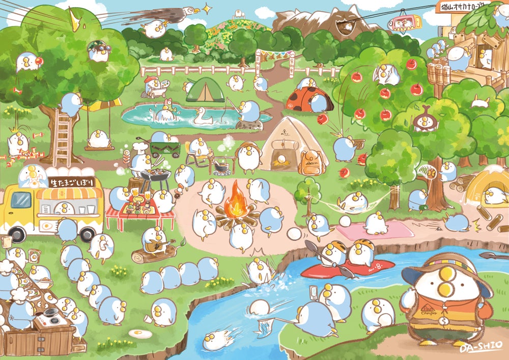 キャンプやアウトドアを楽しむあのとり。が描き込まれた圧巻のイラスト!