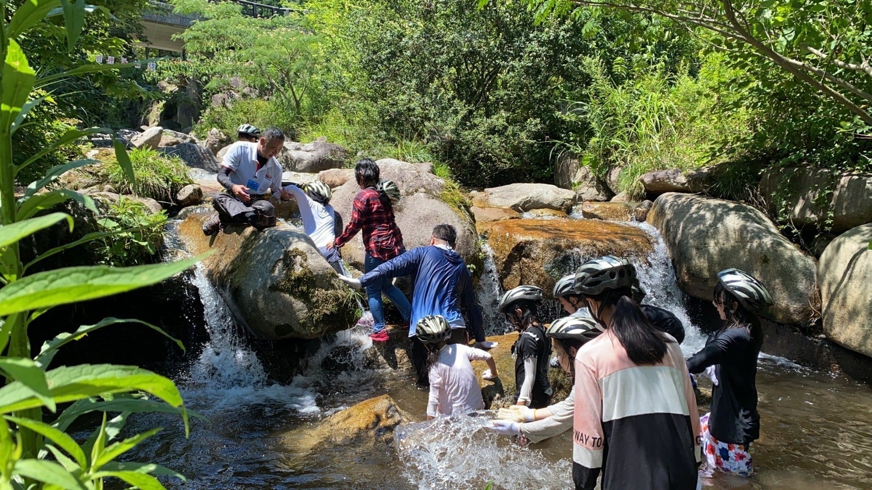 安全説明の後に、川の水に慣れるために、お互いに水を掛け合います。魚を見つけたり川にもぐったり泳いだり...この時点で子供たちは大はしゃぎ。繰り返し真剣な眼差しと笑顔を見せてくれます。