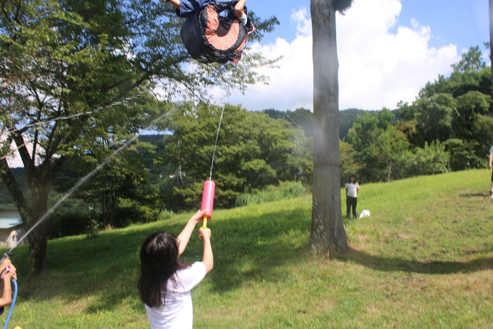 次の遊びは高さ8メートルの巨大ブランコと水鉄砲。そして4輪バギーです。ブランコに乗っている仲間に水鉄砲で水をかけ、インストラクターと一緒に4輪バギーに乗り 子供たちは大興奮。