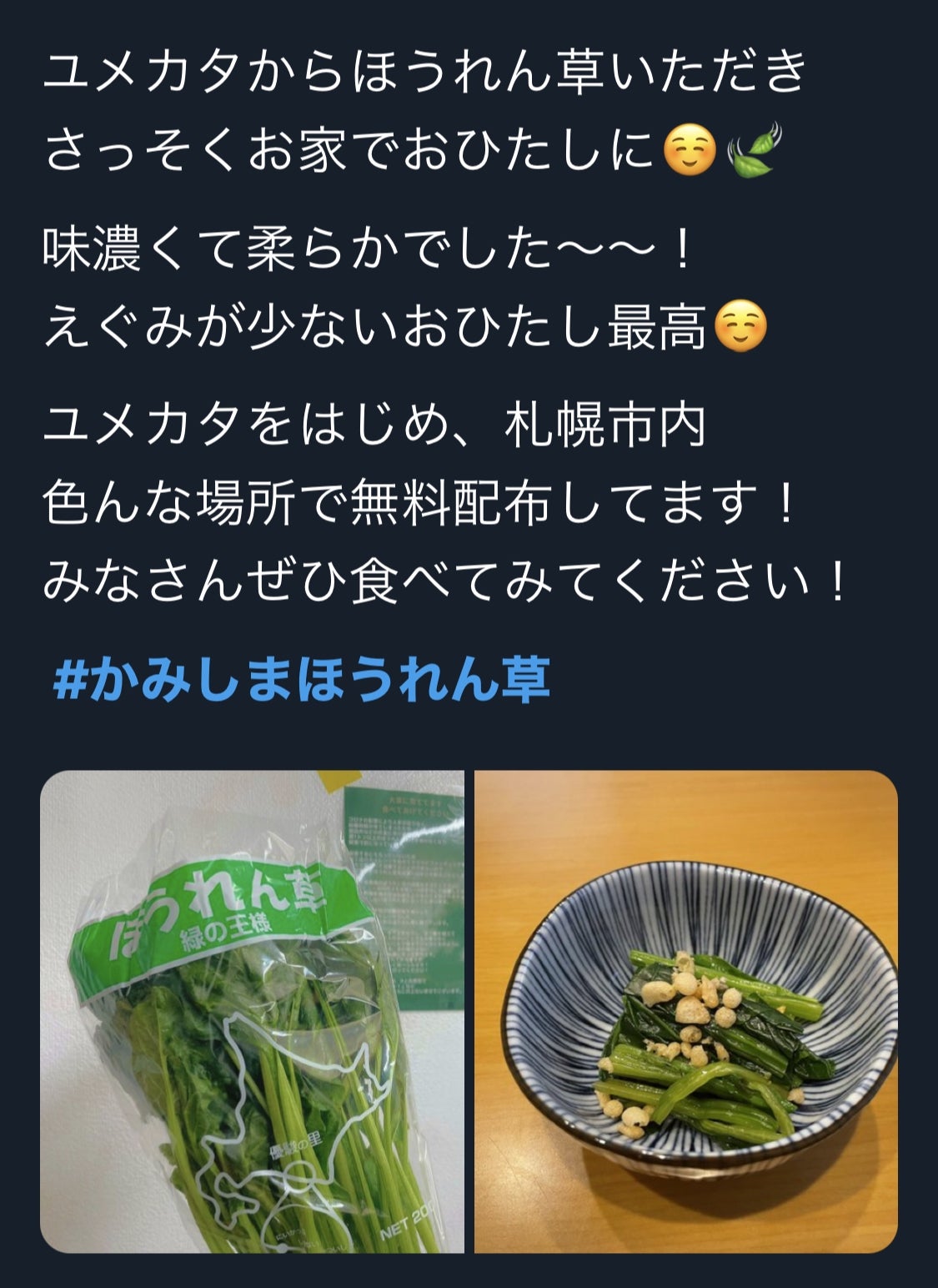 なんとか破棄せずに利用出来ないかと考え、以前支援活動で知り合った木村さんにほうれん草を札幌で1トン配っていただけないかと相談し全て配布していただきました。