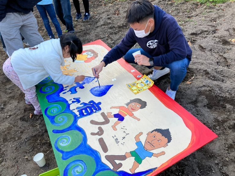 その看板に仕上げとして、みんなでポッチョンを描いて完成!