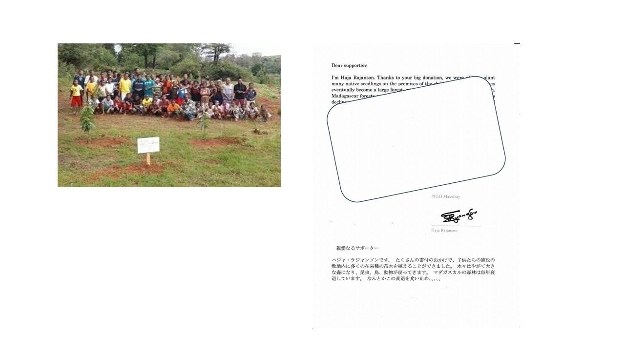 アンバトランピ児童園での植樹風景が写った絵葉書一枚とHajaさんの礼状を郵送いたします。