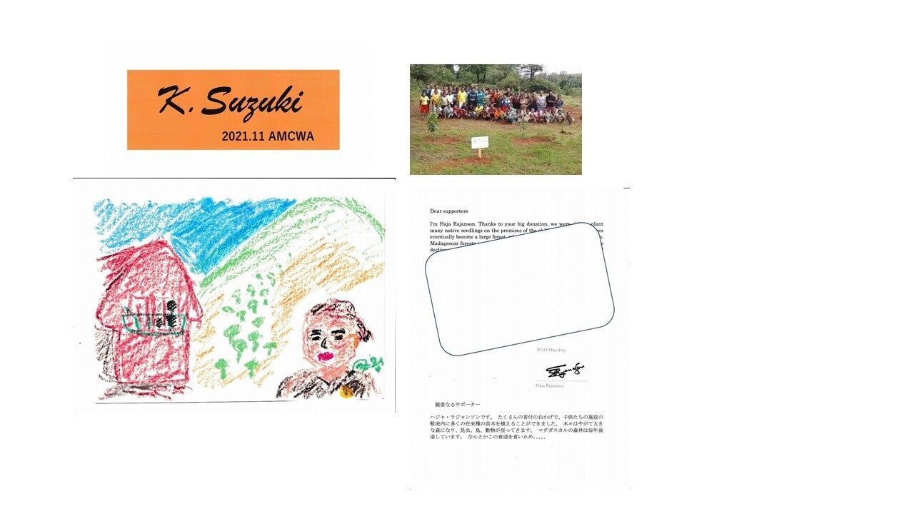 子どもたちが施設、植樹林、本人を描いた絵(3号)を絵葉書一枚、Hajaさんの礼状とともに郵送いたします。さらに植樹する樹木の一つにあなたのお名前をアルファベットで記した名板をお付けします。苗字(Suzuki)及び名前のイニシャル(K)の書き方を必ず備考欄に記入してください。