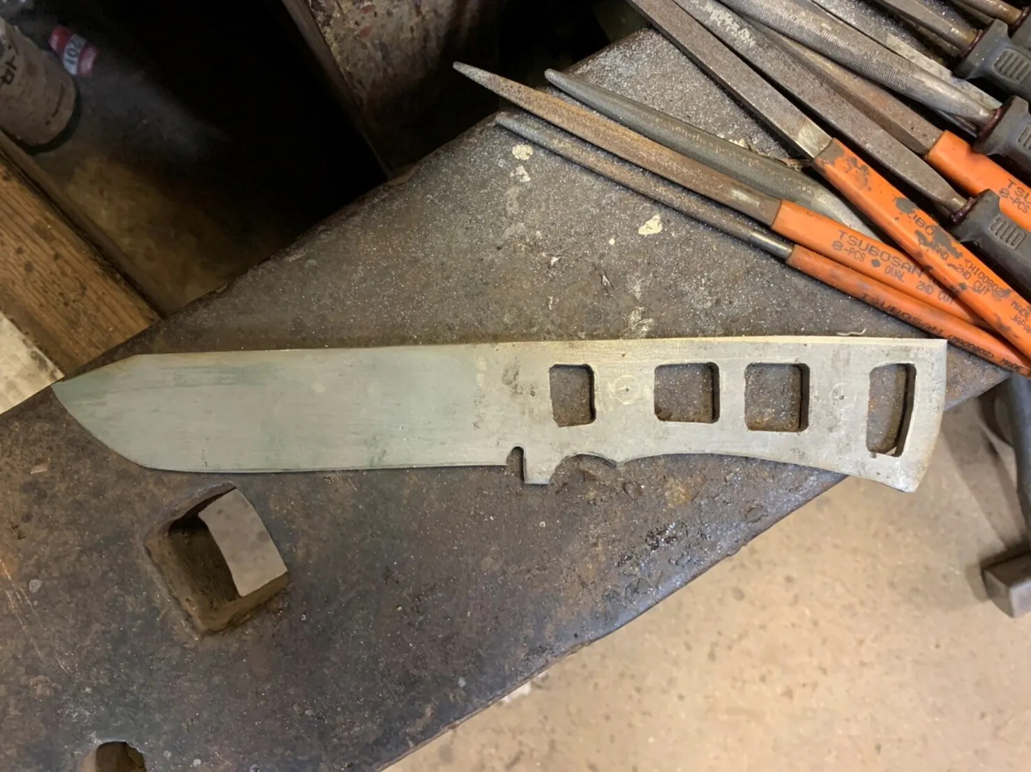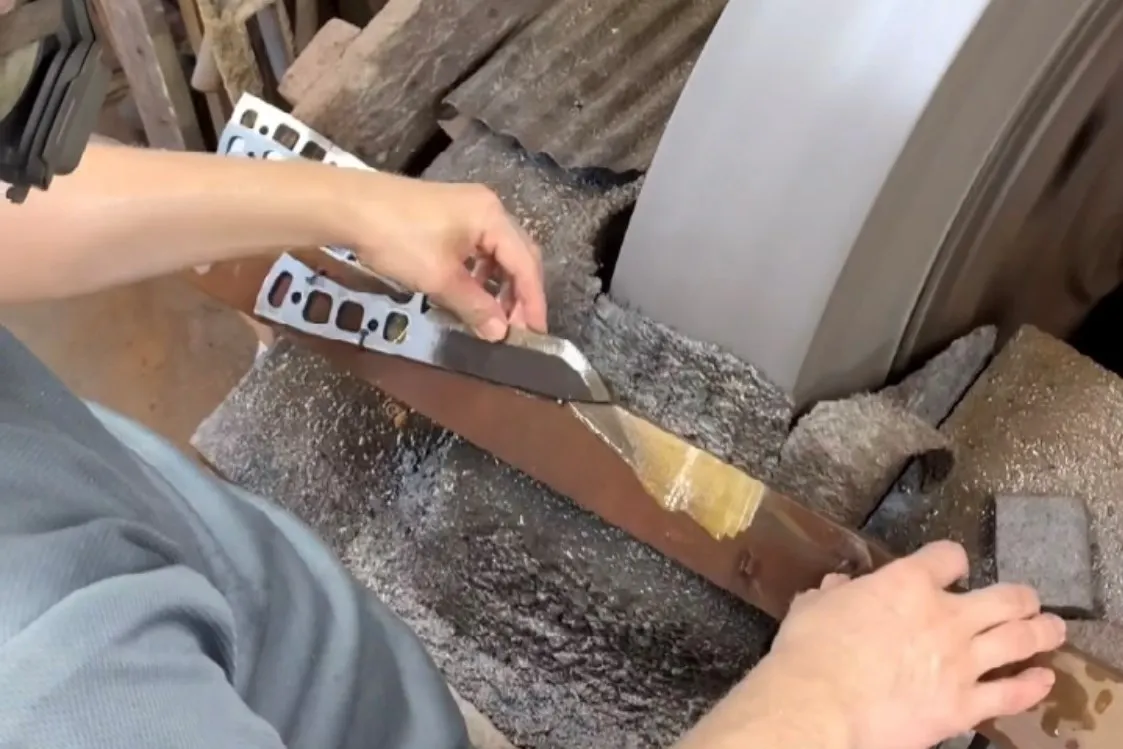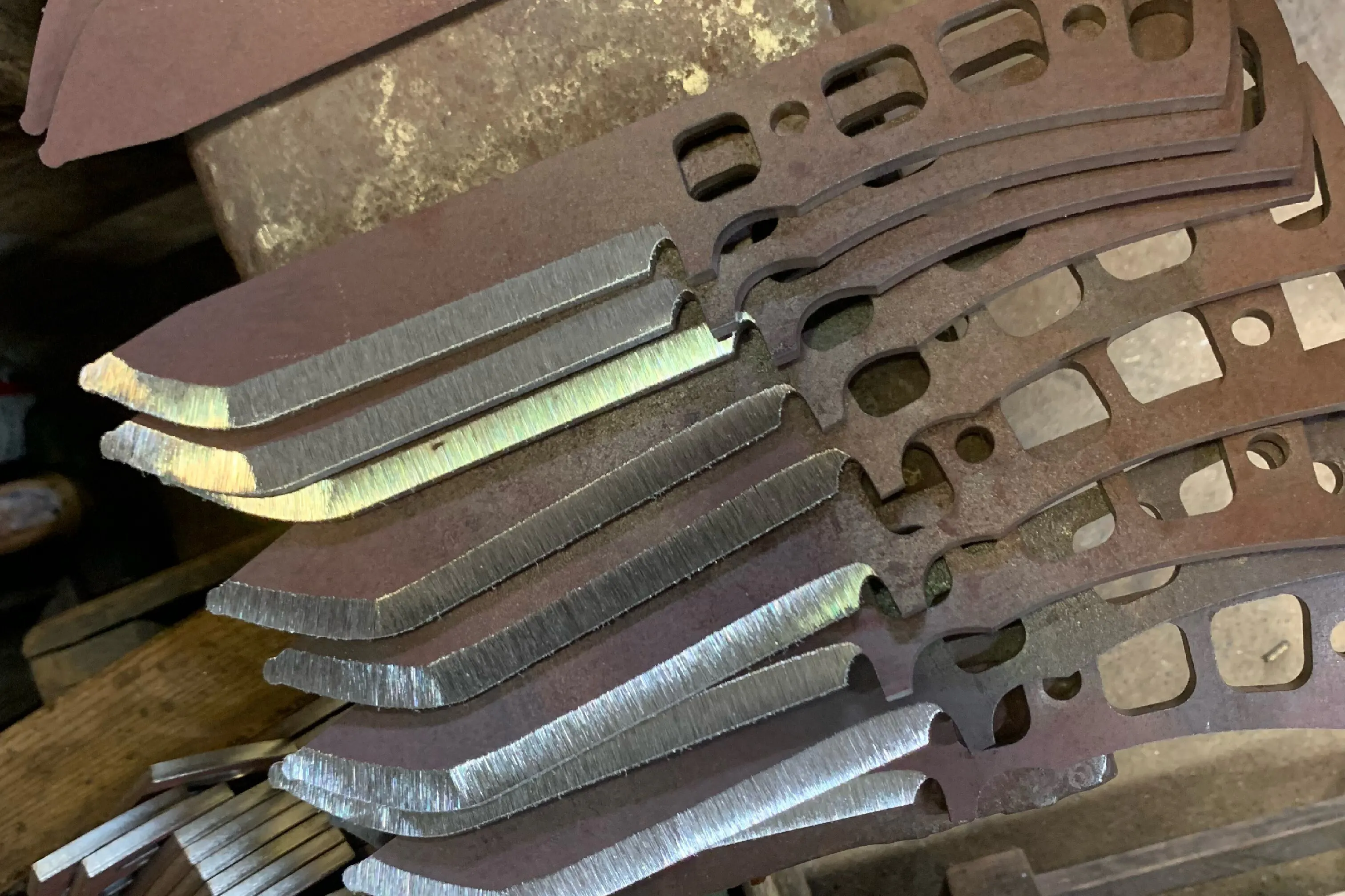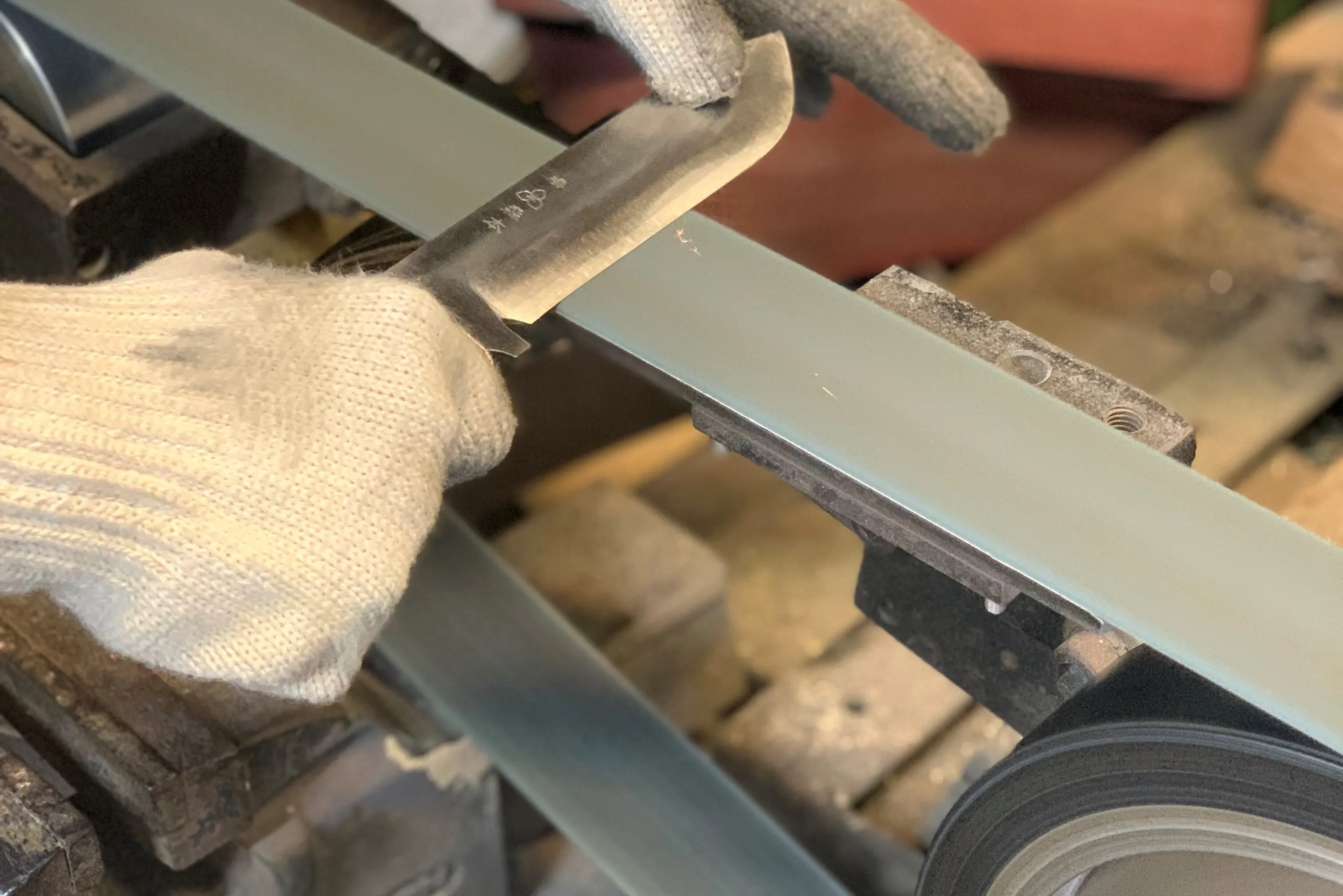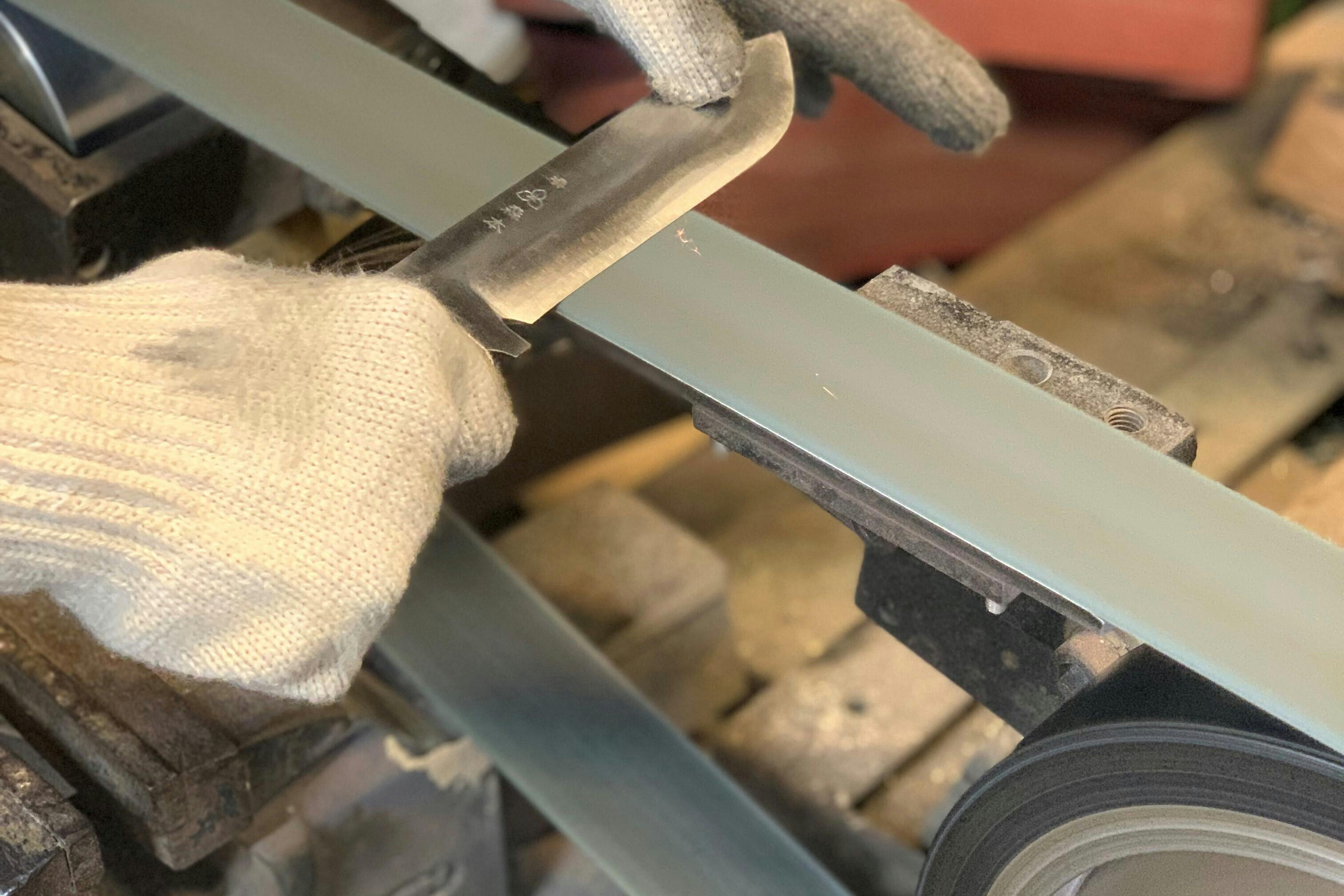 熱処理前にあらかじめ刃部分を10mm 程度の幅で両側から芯材の鋼の厚みくらいまで研いでおきます。ナイフの曲がりがないか確認しあればこの段階でまっすぐに直しておきます。またレーザーカットによる外周の加熱のストレス部分や端面の凸凹を取り、後の仕上工程をスムーズにするために仕上目の手前の細かさまでベルトサンダーでペーパー掛けをします。