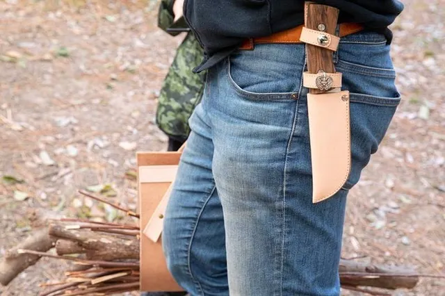 腰にセット。コーヒータイムもカッコよく!(写真は左腰用です。装着した際に刃側が後ろむきになるようにしています。)
