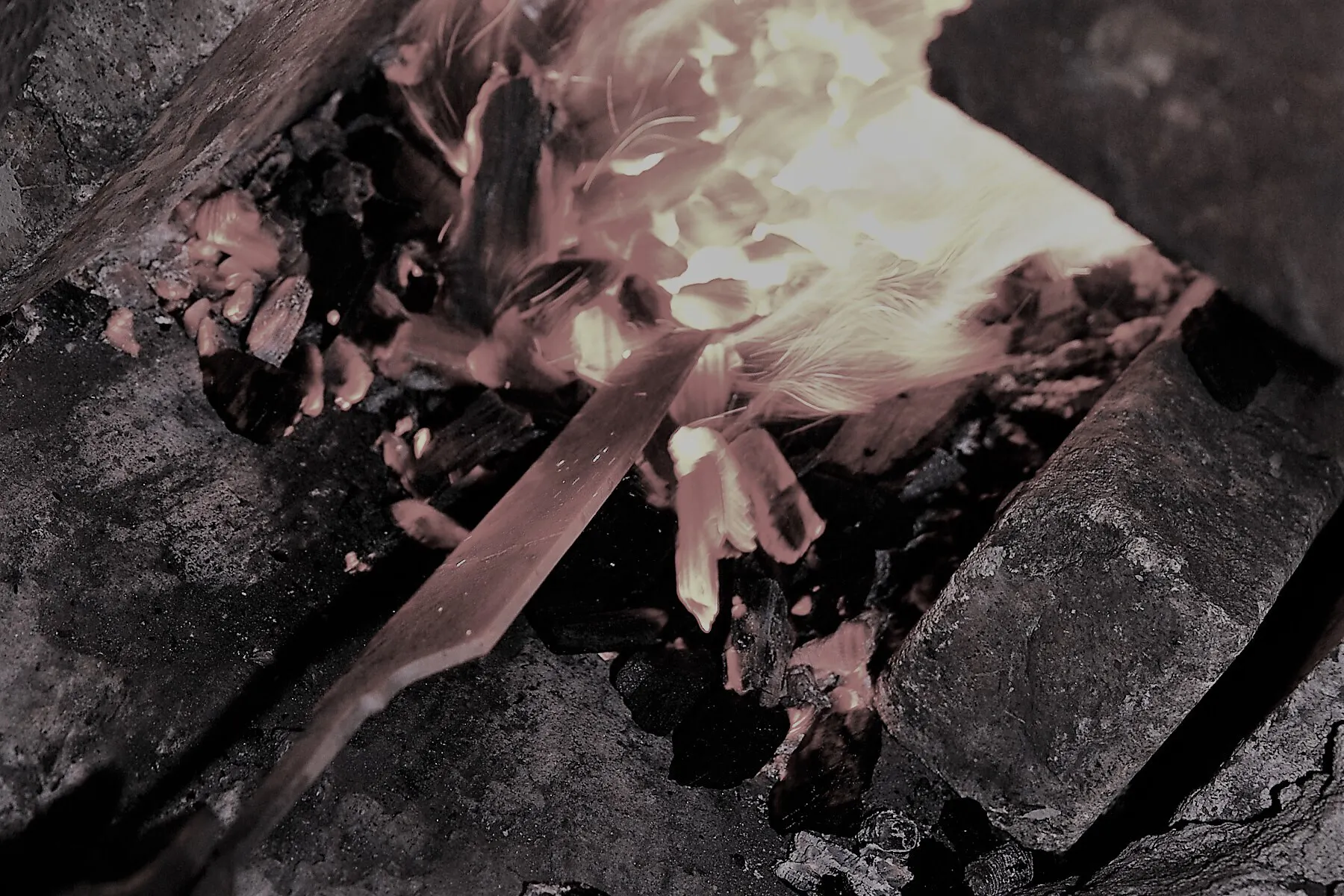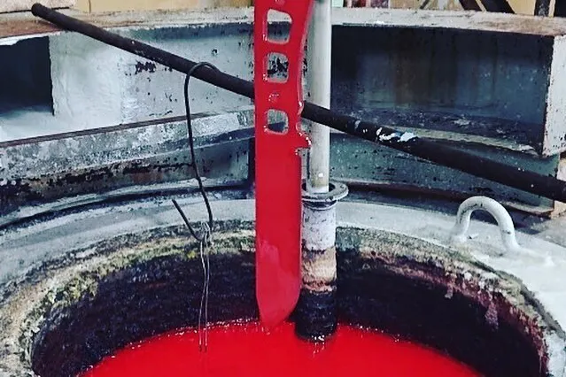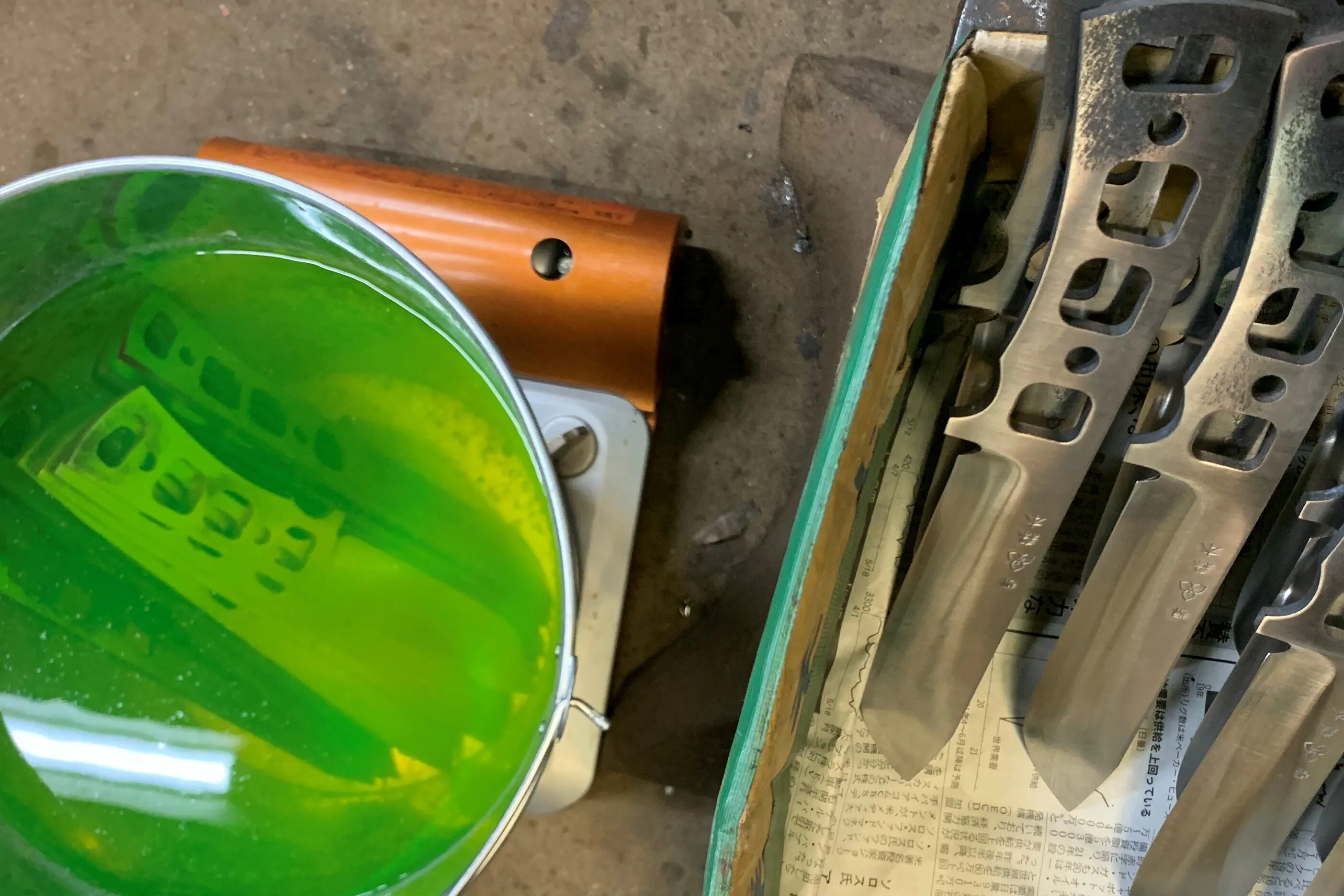 使用している鋼材は白 2 鋼をステンレスでサンドイッチしたもので、包丁によく使用されるポピュラー な組合せですが、今回は5mm厚の通常より厚手鋼材に挑戦。そのため、材料を均一に焼き入れ・焼き戻しするためにソルトバス(塩浴槽)による熱処理加熱・冷却を採用しています。温度ムラが出るのを防ぐために一本ずつ丁寧に温度管理を行っています。 また、タフな使用に耐えられるよう通常1度の焼き戻しを2度行い欠けにくくし耐久性を高めています。