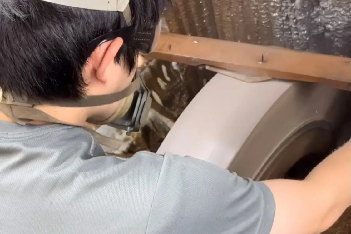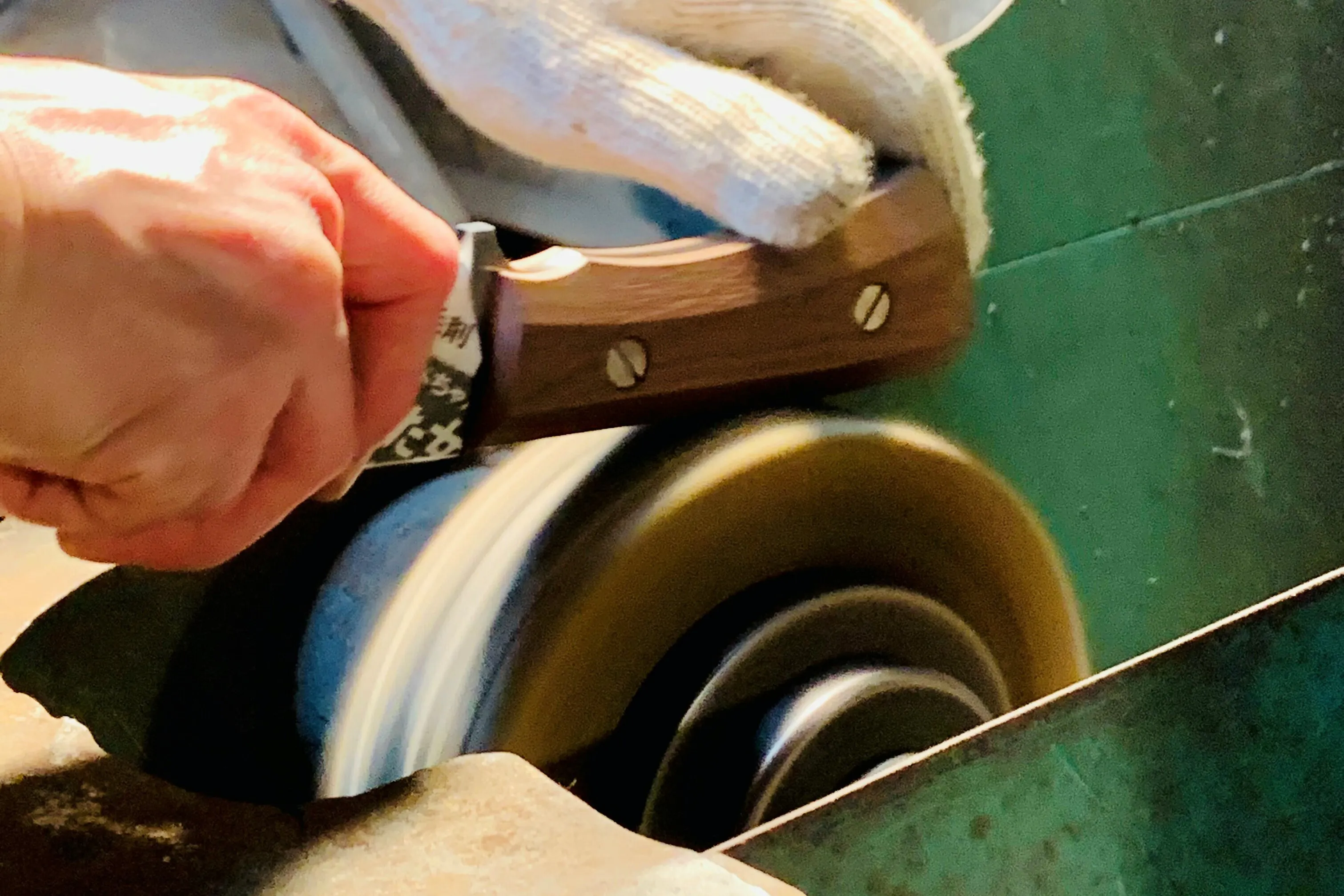 包丁と同じく専用の研ぎ棒に取り付けて荒い円砥石でほぼ実際の刃の厚み近くまで一気に研いでいきます。