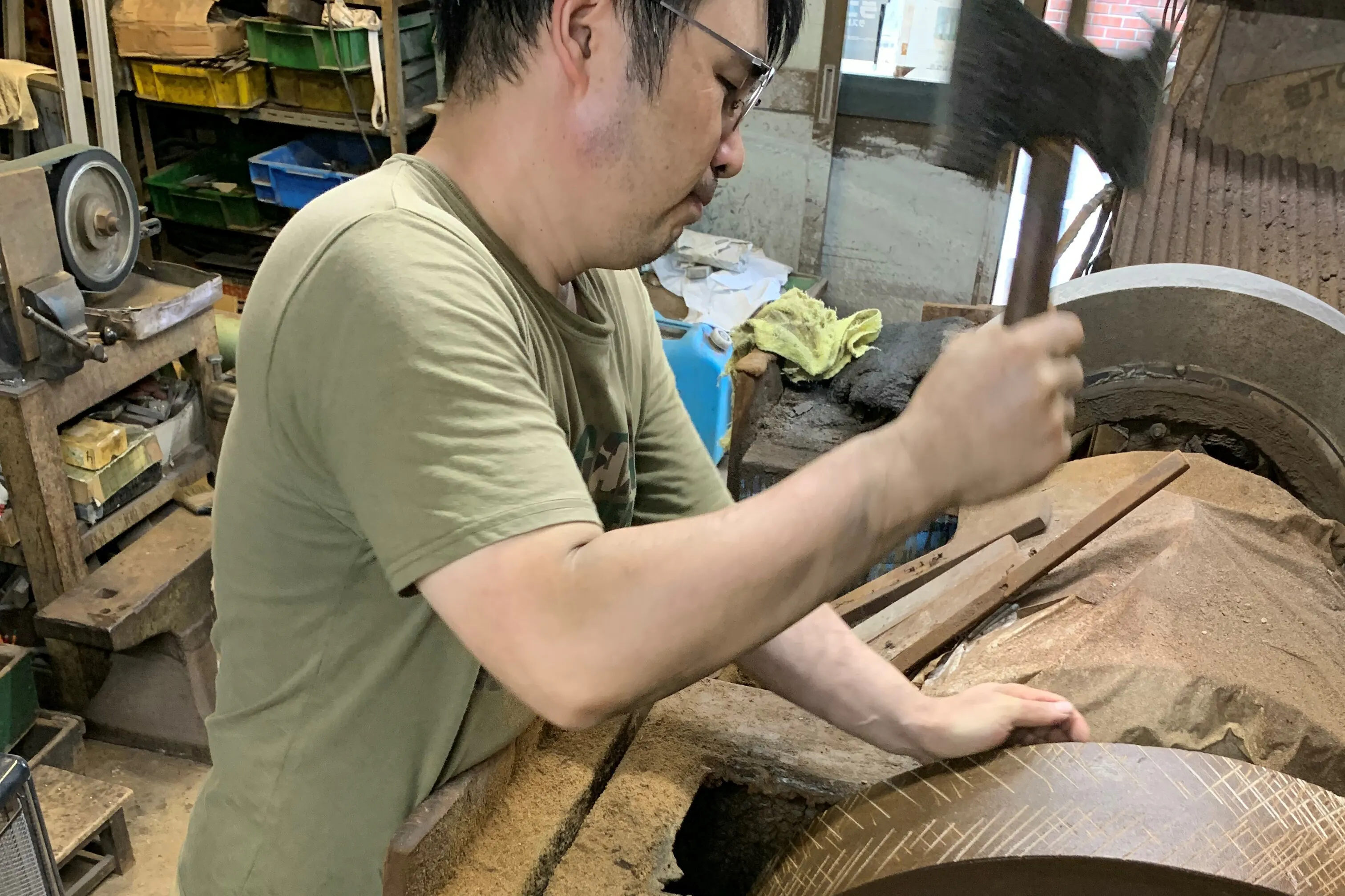 刃物をつくるいくつもの工程の中で森本刃物製作所の伝統工芸士・森本が担うのは、研いで刃をつける「刃付(はつけ)」と呼ばれる仕事。硬さと粘りを併せ持った包丁地(刃付けされるまえの鋼材)が鍛冶職人から刃付職人・森本へ引き渡され、森本は1本1本の状態を見極め、鍛冶職人の仕事に応えていきます。