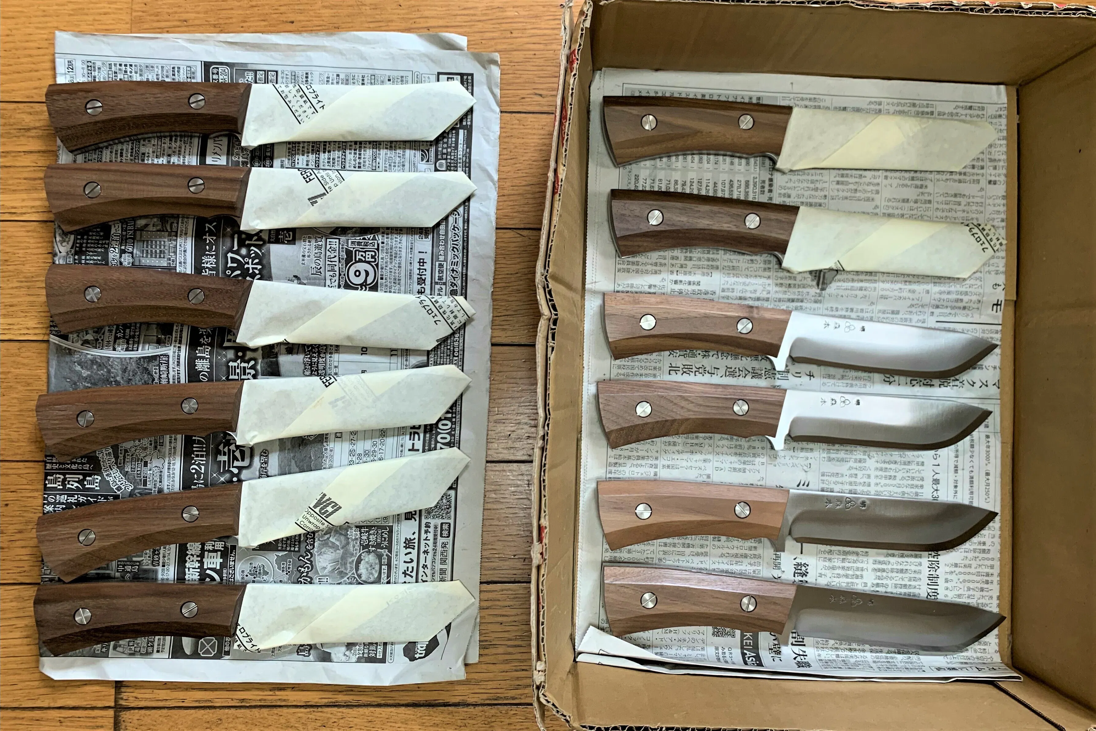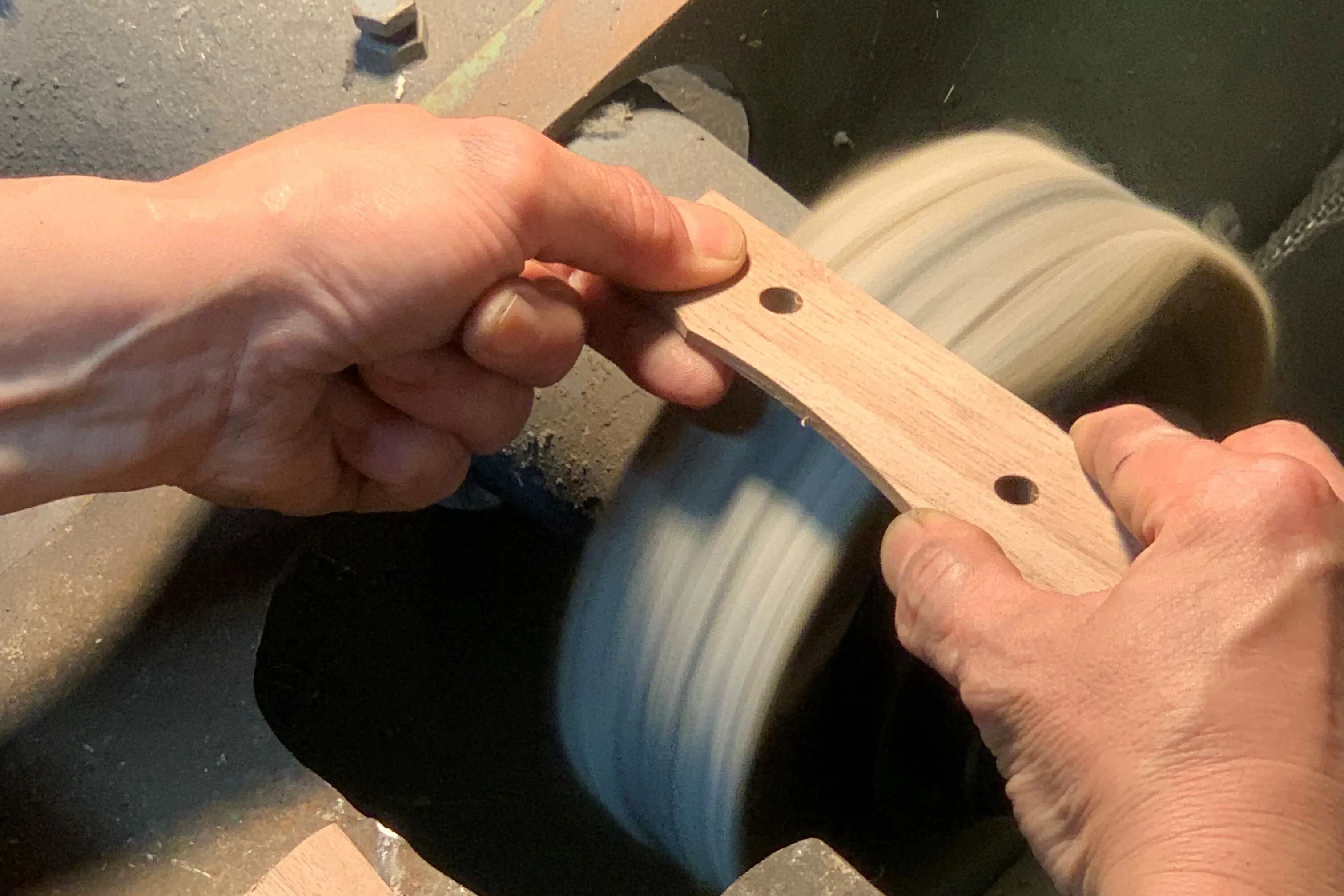 ウォールナット材を一組ずつあわせた際に、きちんと木目が合うようにして制作いただきました。制作は、普段から包丁の柄材でお世話になっている、関の「岡田木工製作所」さまにお願いしました。