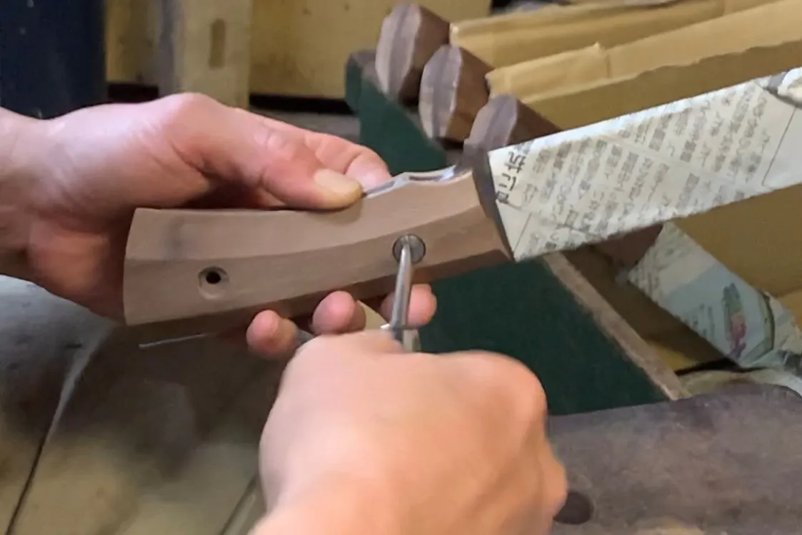 専用ボルトナットでナイフ本体と柄材を組み合わ せます。