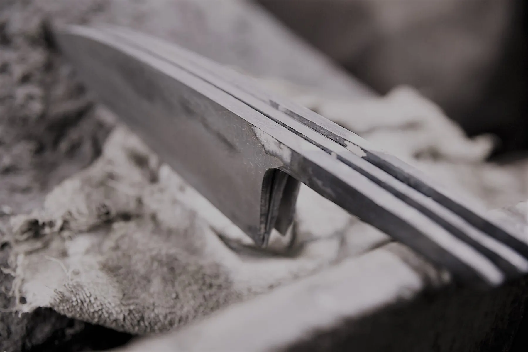 オリジナルサンドイッチ鋼材 : 数ある鋼材の中から「炭素鋼・白紙2号」をステンレス鋼で挟んだ割込包丁と同じ材料を厚物ナイフ用に新しく製造しました。