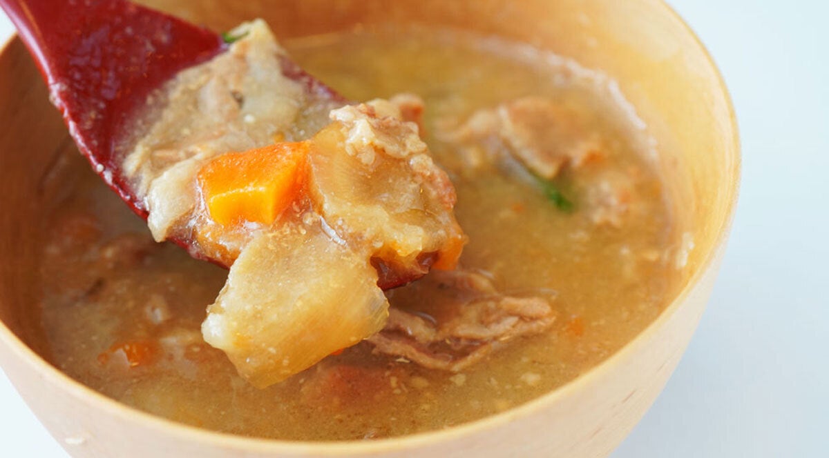 豚肉と玉ねぎなどの野菜をじっくり煮込んで甘みとうまみを引き出した豚汁です。