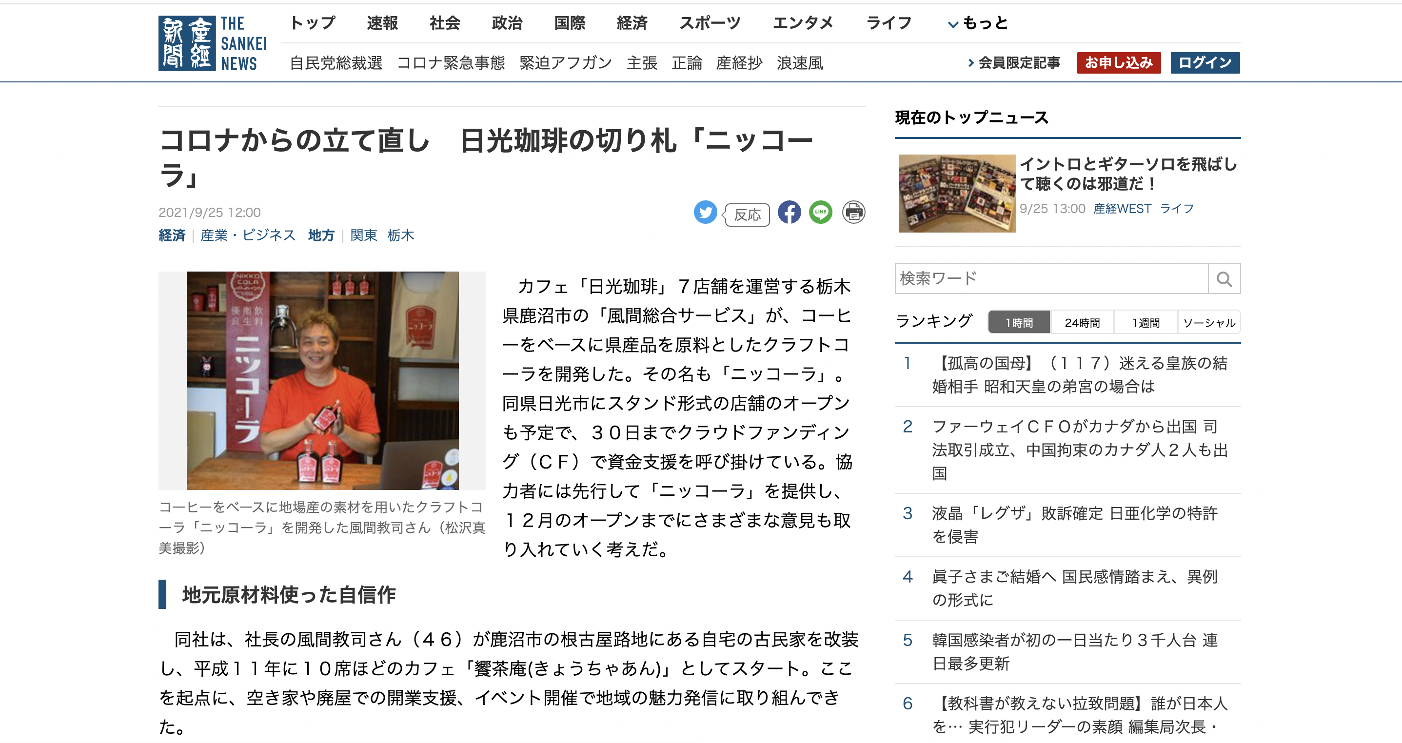 2021/09/25 13:35「ニッコーラ」9/25付、産経新聞に掲載されました。 もっと見る