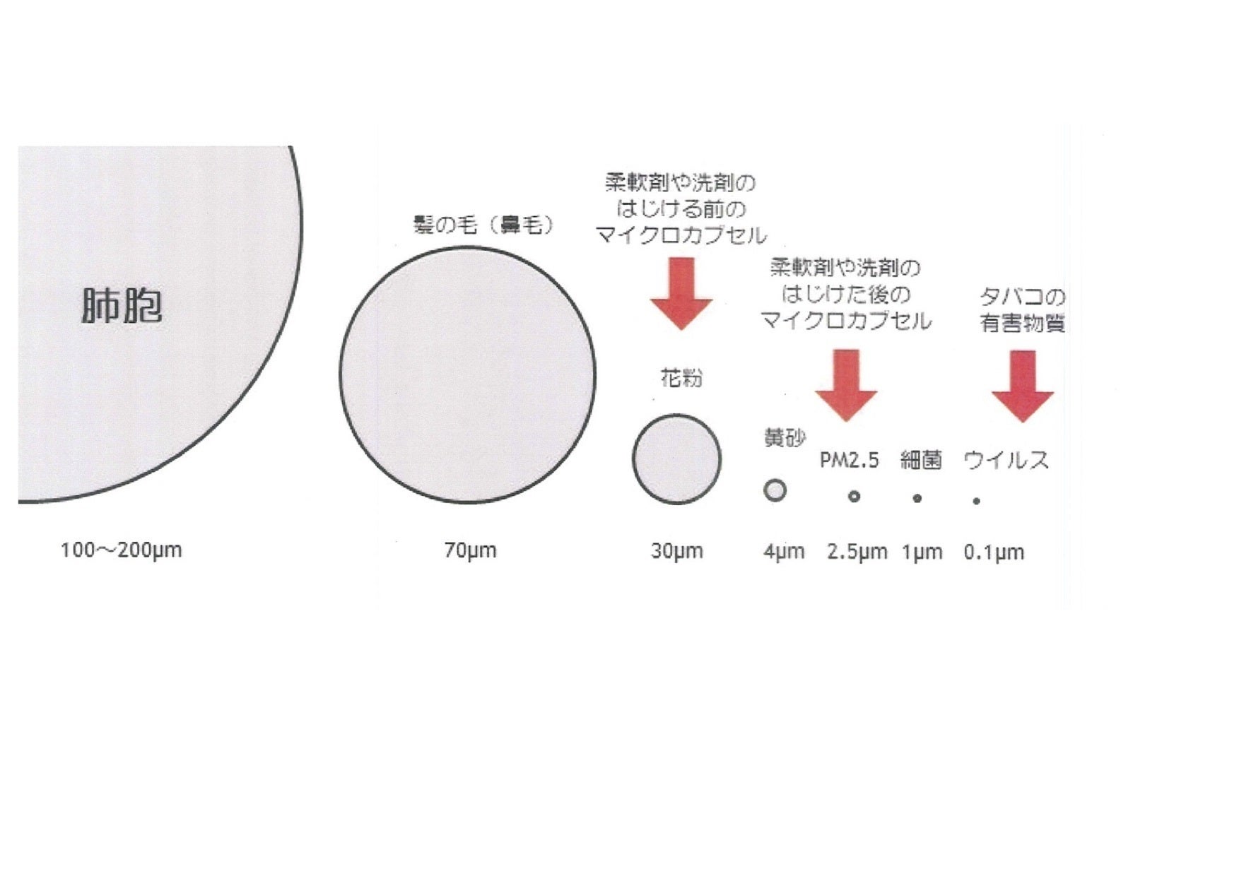 柔軟剤利用時の1回の規定量には、1億カプセルが入っているとも宣伝されています。1個のマイクロカプセルは、花粉くらいの大きさで、それが壊れるとPM2.5サイズともいわれており、私たちの肺の奥まで入り込みます。