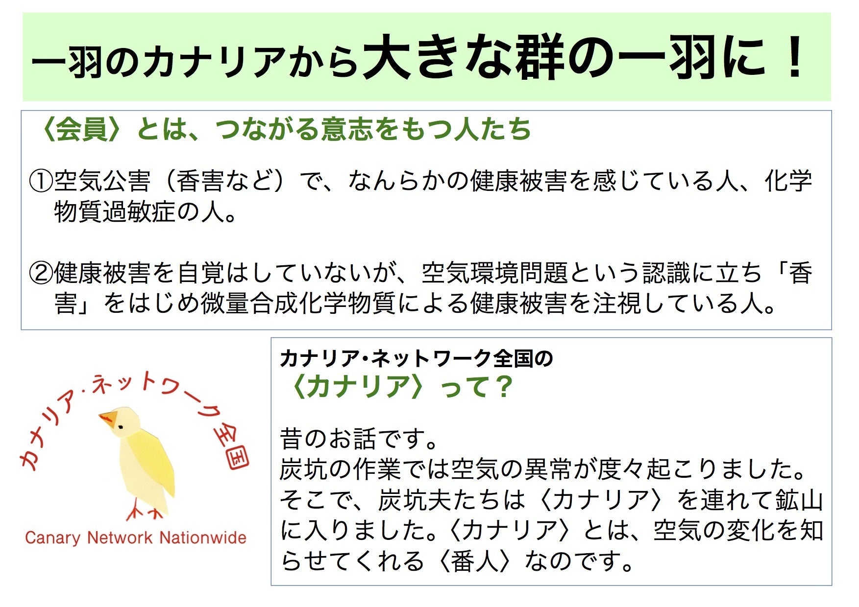 これ以上、その被害を拡げないためにも、またすでに健康被害を起こしていても、それが香料や微量の化学物質によるものだと気がついていない仲間たちのためにも、空気公害で苦しむカナリアたちはひとつになって声をあげるときが来ました。