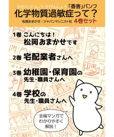 「甘い香り」に潜むリスク 香害は公害(A5判/96頁/1,210円)/香害パンフ4冊 化学物質過敏症って?(A5判/各32頁/1巻~4巻セット1,320円)/マイクロカプセル香害(新書判/192頁/1,540円)/空気の授業(四六判/144頁/1,650円)