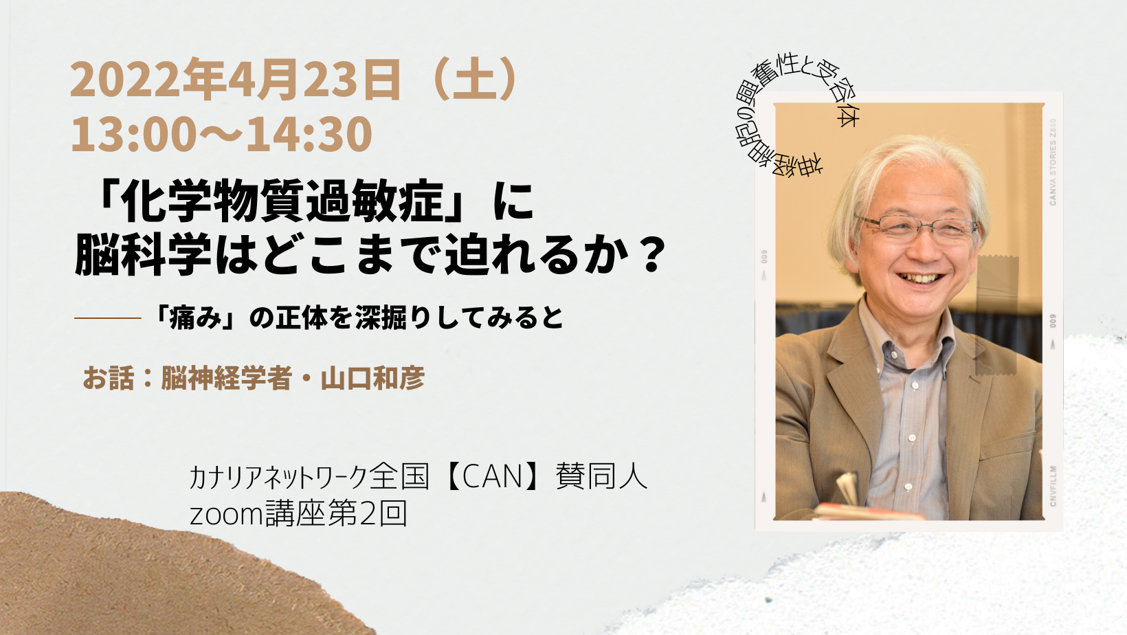 カナリア・ネットワーク全国 クラウドファンディングご支援いただきました皆様へCAN賛同人を講師に迎えるzoom連続講座の第二回目のお知らせです。今回の講座は、有料となります。一般チケット 1000円CAN会員チケット 700円まだ、CANの会員登録がお済みでない方は、ぜひこの機会にご登録のうえ、チケットをご購入ください。【講演について】過去、1999年代に新建材建築に使用されたホルムアルデヒドを原因としたシックハウス症候群により、「化学物質過敏症」を発症した人が多数でました。ご存知のように、2010年前後より、香料をきっかけとした「化学物質過敏症」が増加したと専門医はいいます。その20年間で嗅覚神経など、脳神経学の分野の躍進は大きく、マスコミでもそれを専門とする研究者たちを見ない日はありません。また、厚労省の補助金で「中枢神経感作により諸症状が引き起こされている」といった報告やすでに投薬治療が進んでいるとの報告もあります。「侵害刺激(痛み刺激)」など、耳慣れない専門用語から、脳神経学からみた化学物質過敏症の原因仮説までを、山口和彦さんに平明に語っていただきます。山口和彦(やまぐち・かずひこ)プロフィール:1953年東京都生まれ。脳神経科学者。医学博士・理学博士。元理化学研究所・脳神経センター研究員。現国立研究開発法人国立精神・神経医療研究センター 神経研究所・微細構造研究部 客員研究員。脳の神経回路、神経細胞の興奮性や受容体について研究を続けてきた。CAN会員:¥700 お申込みはこちらから⇒ 関連情報・イベント申込 – カナリア・ネットワーク全国公式https://canary-network.org/news/kouen2/※18歳以下の方には無料チケットをお渡しします。ユーザーIDも明記でご連絡ください⇒ お問い合わせ – カナリア・ネットワーク全国公式https://canary-network.org/