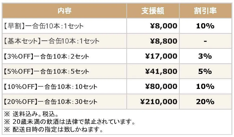今回、リターン配送後に使用可能な一合缶2本分の引換券(1支援につき1枚)をプレゼントします!