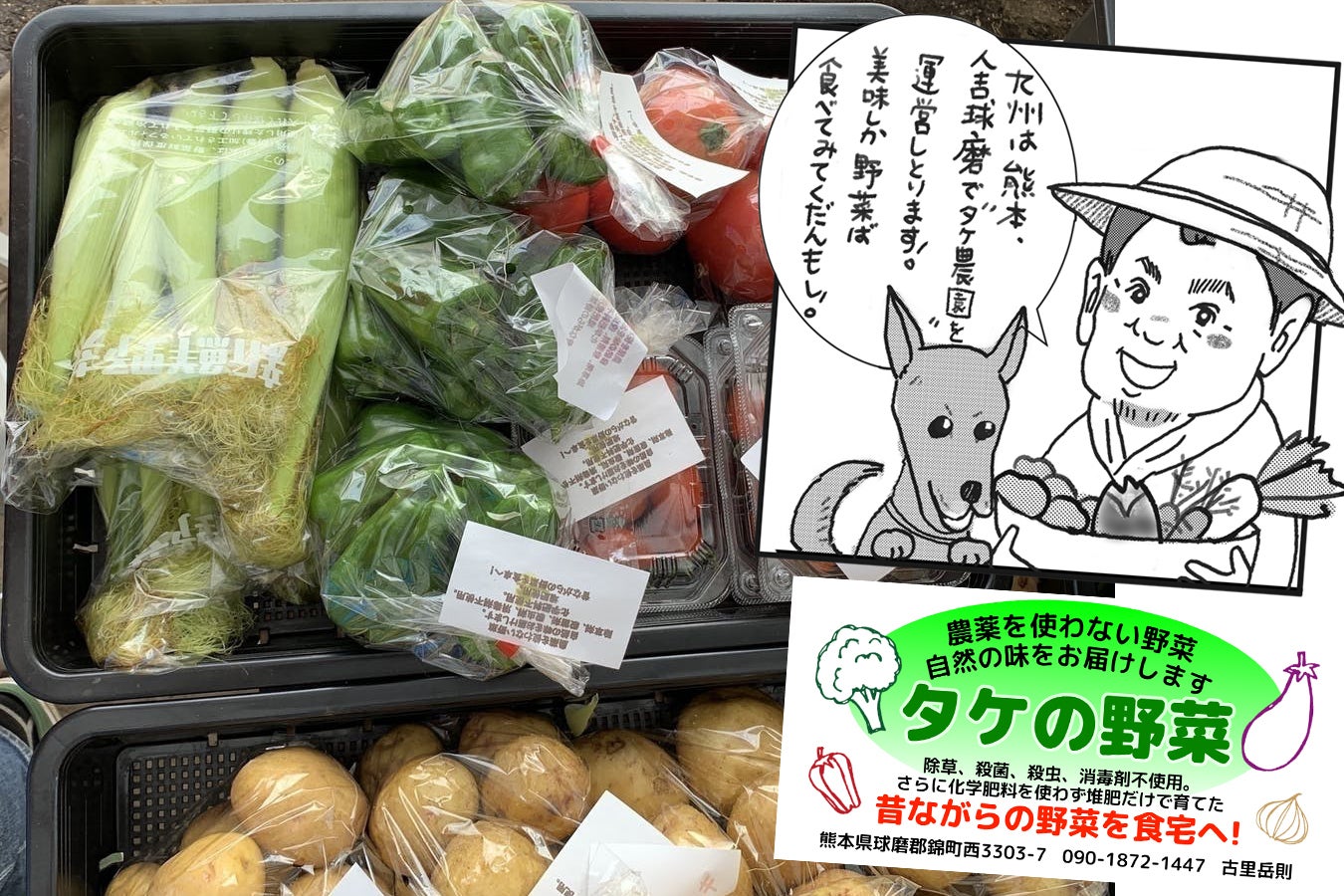無農薬で野菜を栽培されている『タケの野菜』の古里さんにご協力いただき、無農薬野菜詰め合わせセットをリターン品としてご提供いただきました。