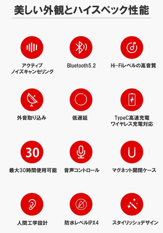 - ワイヤレス充電対応!IPX4!Bluetooth5.2!左右独立型!自動ペアリング等機能が充実