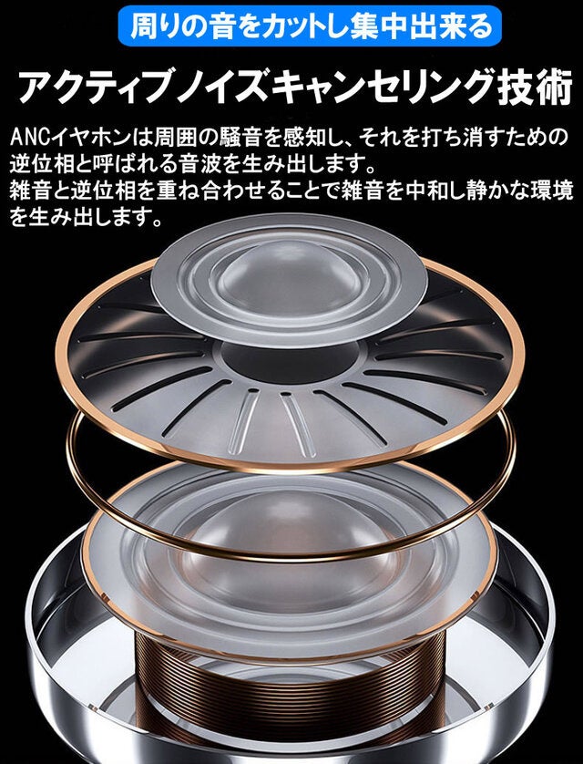 周囲の騒音を感知し、それを打ち消すための逆位相と呼ばれる音波を生み出します。