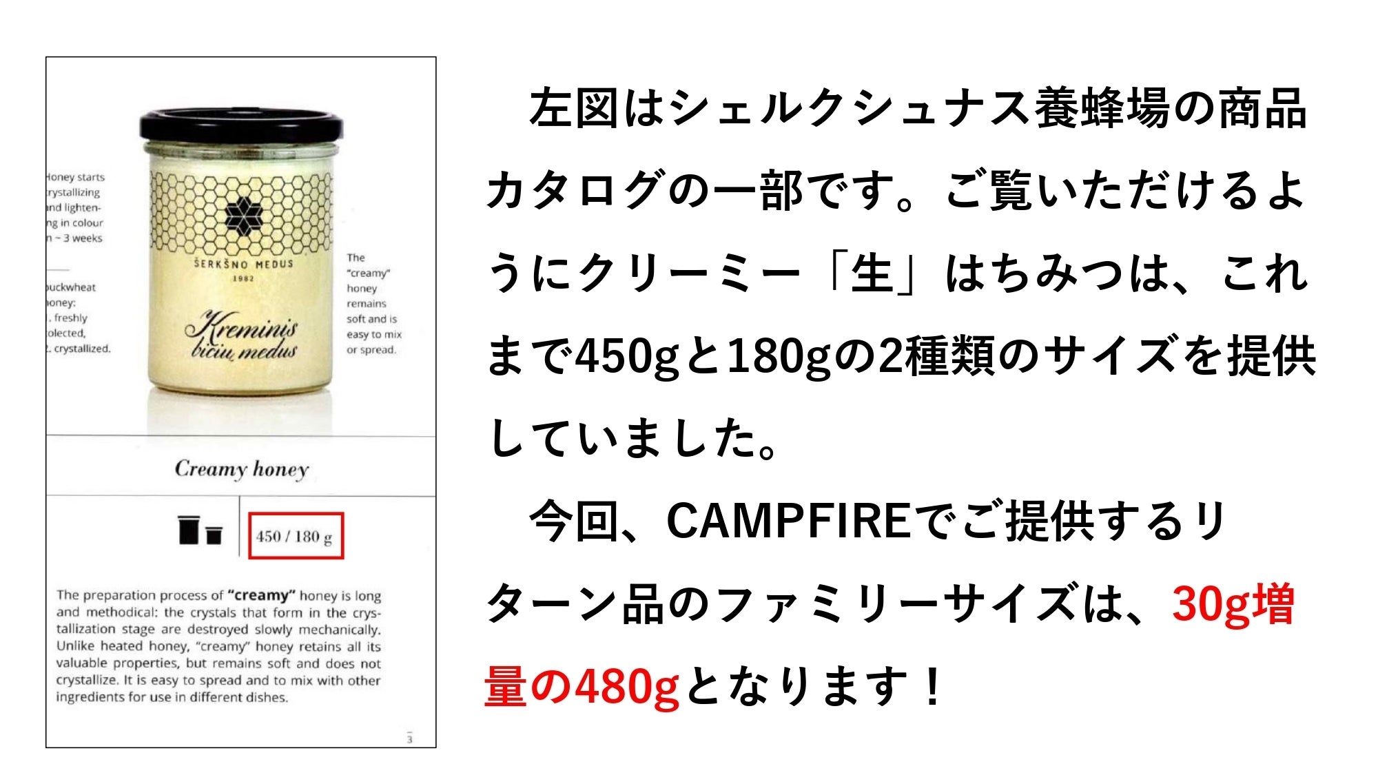 そんなご購入者様の声を受けて、このたび、クリーミー「生」はちみつファミリーサイズをご紹介します。さらにCAMPFIRE限定価格+商品割引券でご提供いたします。ぜひご賞味ください。
