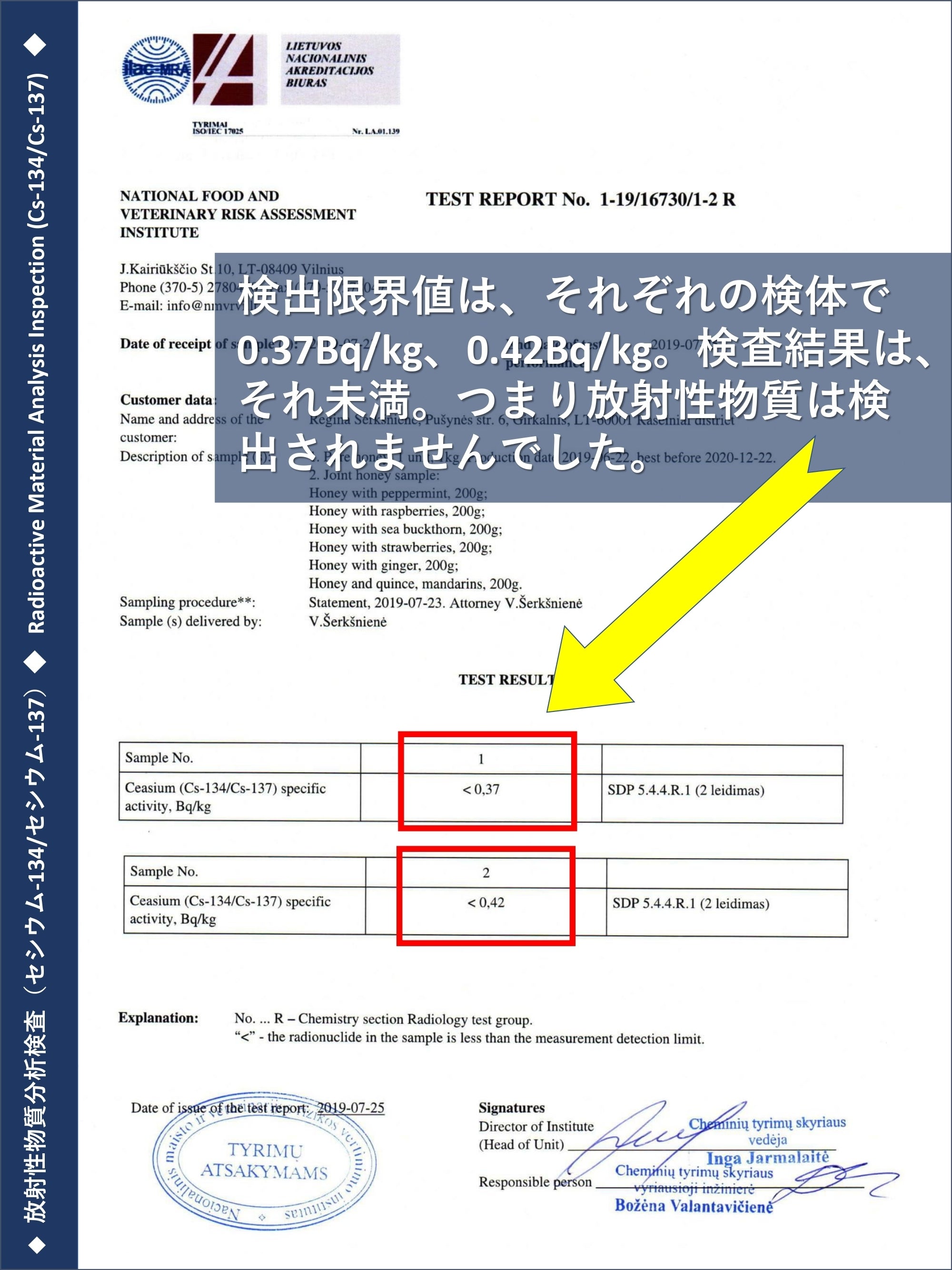 *リトアニア国立食品獣医学リスク分析研究所(National Food and Veterinary Risk Assessment Institute)は、日本の厚生労働省が食品等の検査をするためリトアニア国内で唯一公的に認めている分析機関です。