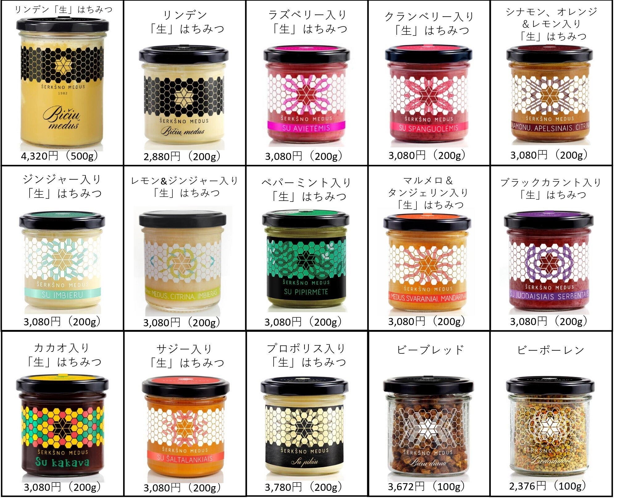※今回のプロジェクトで紹介しているクリーミー高級「生」はちみつ(480g、180g)の2商品と下記の14種類 (15商品) の合計:15種類 (17商品) の中からお好きな商品をお選び頂けます。