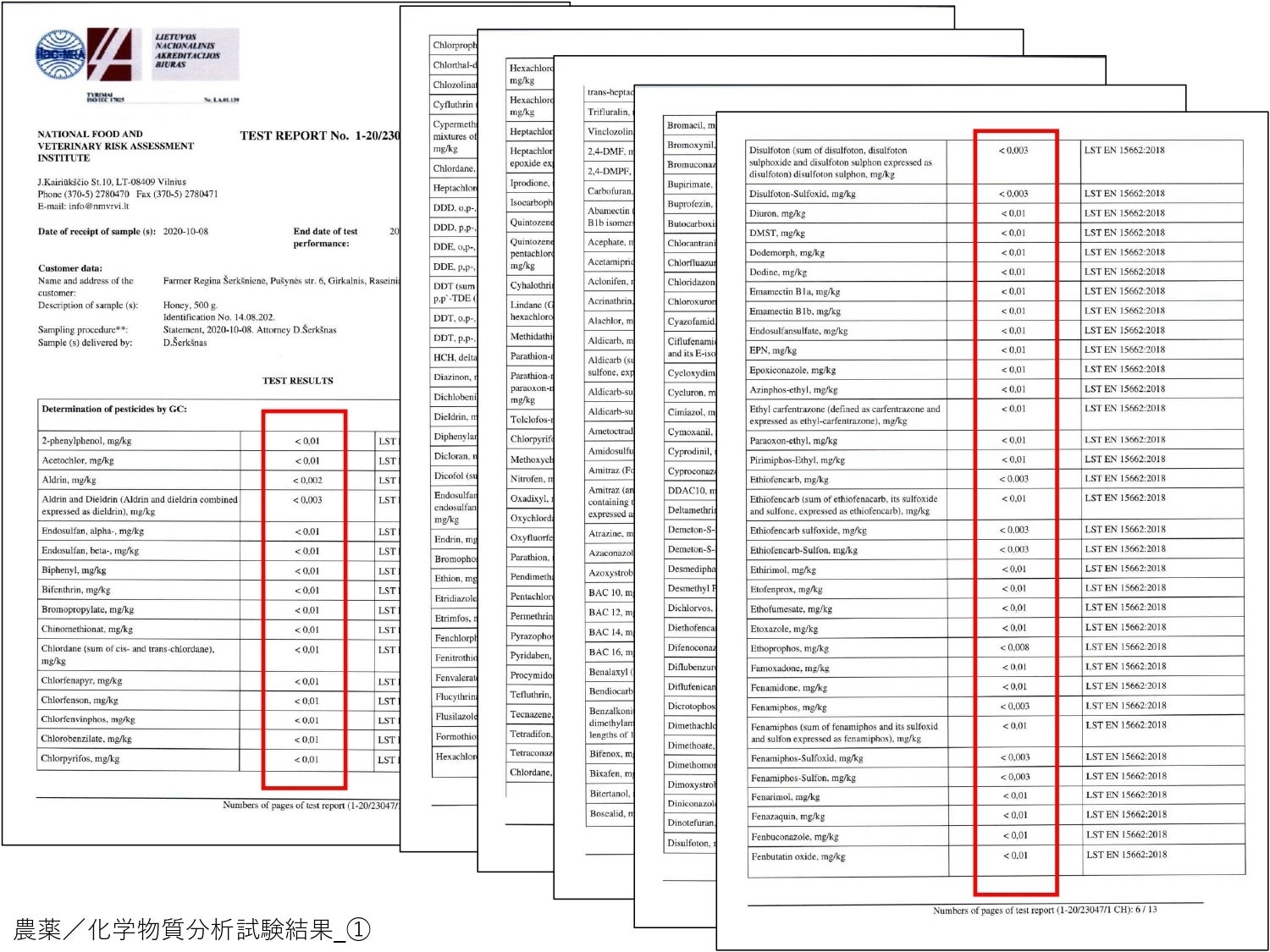 シェルクシュナス養蜂場では、農薬や化学物質は一切使用していませんが、農薬・化学物質・放射性物質の汚染がないかをリトアニア国立食品獣医学リスク分析研究所*に検査を依頼し、その安全性を確認しています。2019年7月および2020年10月に実施した分析検査において農薬・化学物質・放射性物質は検出されませんでした。