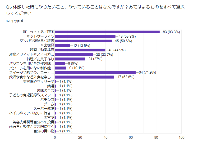 「ぼーっとしたい・寝たい」「ネット/漫画/雑誌を見たい」「スイーツ、食事を楽しみたい」「子育て相談ができるプロがいてほしい」「FreeWi-Fiがほしい」「個室が欲しい」…などなど。