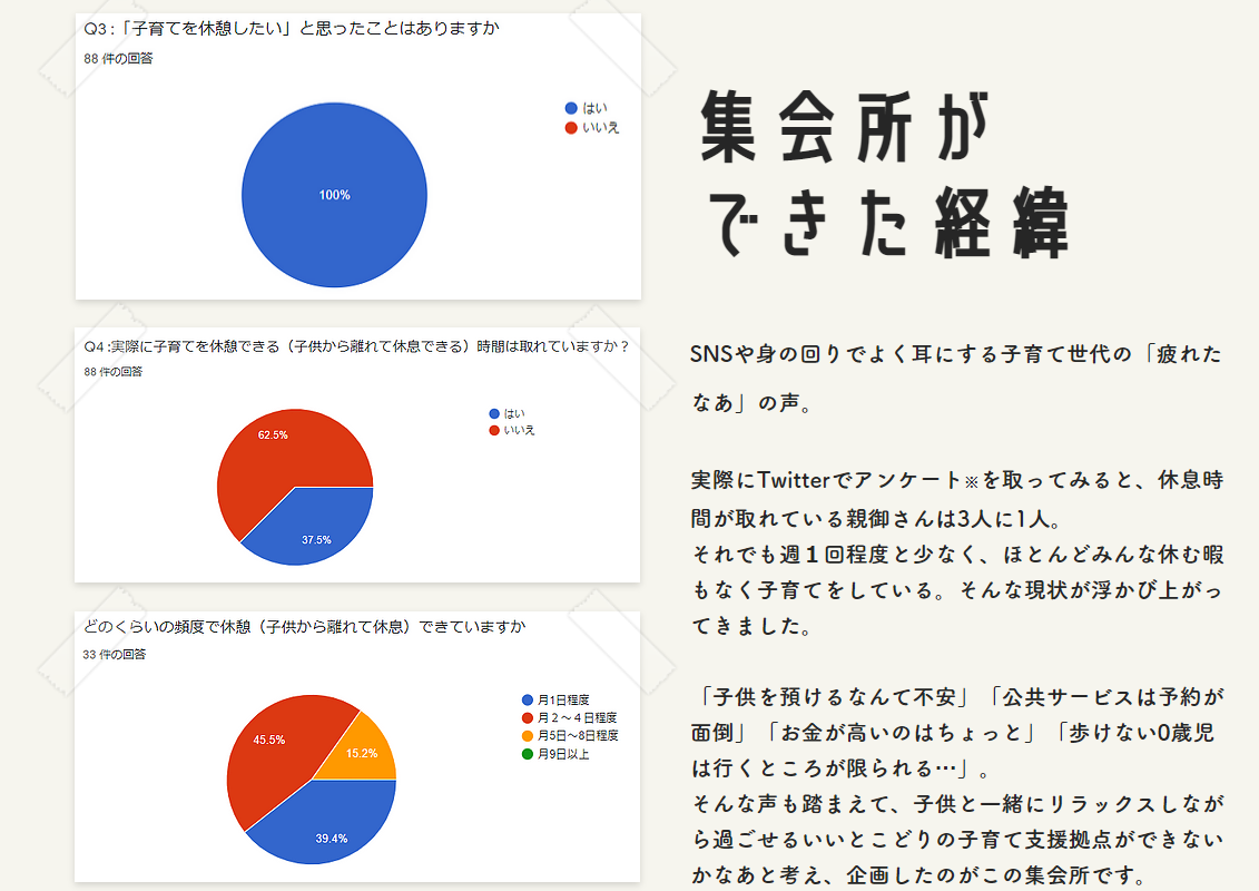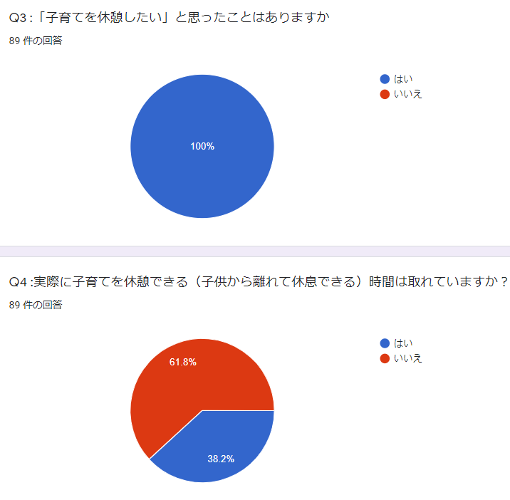 虐待、産後うつ、子育てがつらくて疲弊してしまう保護者をSNSでたくさん見てきました。みんな、自分ひとりで子育てをしたり悩みを抱えているひとばかりで心の余裕がなくなっているようにも思いました。保護者の休息が必要なのではと思った私は、SNSで子育て中の休息についてのアンケートを取りました。すると驚くべきことに、子育てを休憩したいと思ったことがある保護者は100%。そのうち約4割しか実際に休息をとれていないというのです。