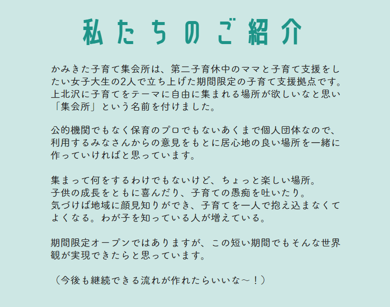 コロナ禍で子連れの出先が限られる今、「遠出しないお出かけ」は子育て中のパパママの数少ないリフレッシュ方法です。そんな彼らの「疲れた~!」「たまには一人になりたい~!」「ぼーっとしたい!」をかなえるべく、まずは私の地元、世田谷区上北沢地域での子育て支援事業の立ち上げを検討しています。