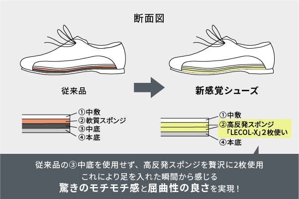 - 更に従来のクッション構造をより進化させクッション性の高い新素材高反発スポンジ「LECOL-X」をなんと!中敷きと靴底の間に贅沢に2枚使用。