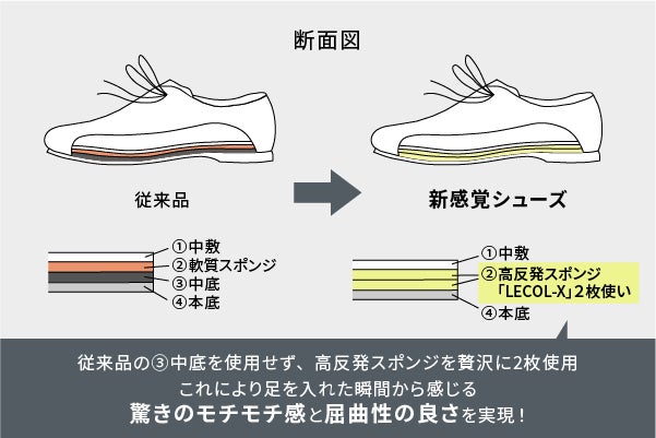 • 更に従来のクッション構造をより進化させクッション性の高い新素材高反発スポンジ「LECOL-X」をなんと!中敷きと靴底の間に贅沢に2枚使用