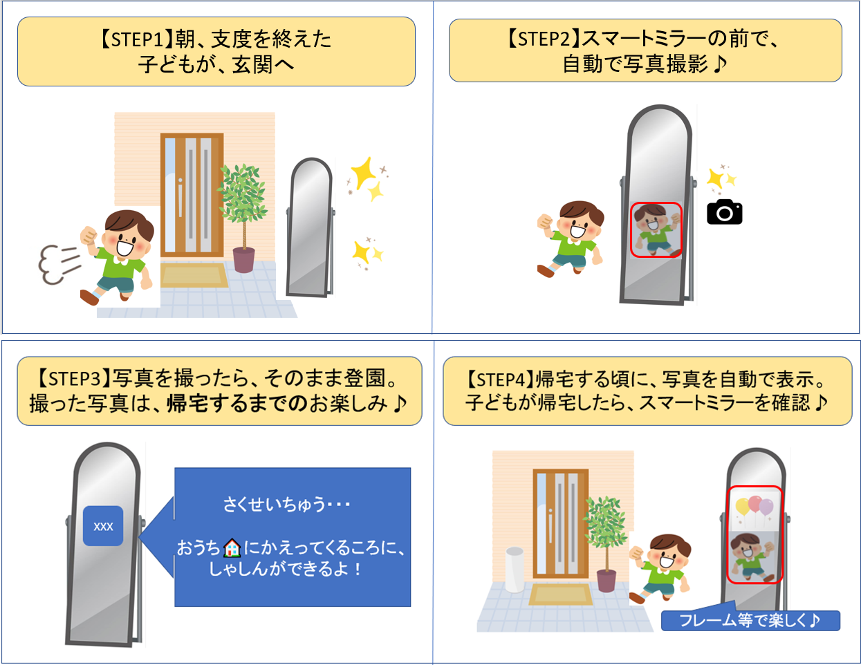 ●玄関に設置したスマートミラーで、写真を楽しく自動で撮影・記録♪(以下、イメージ)